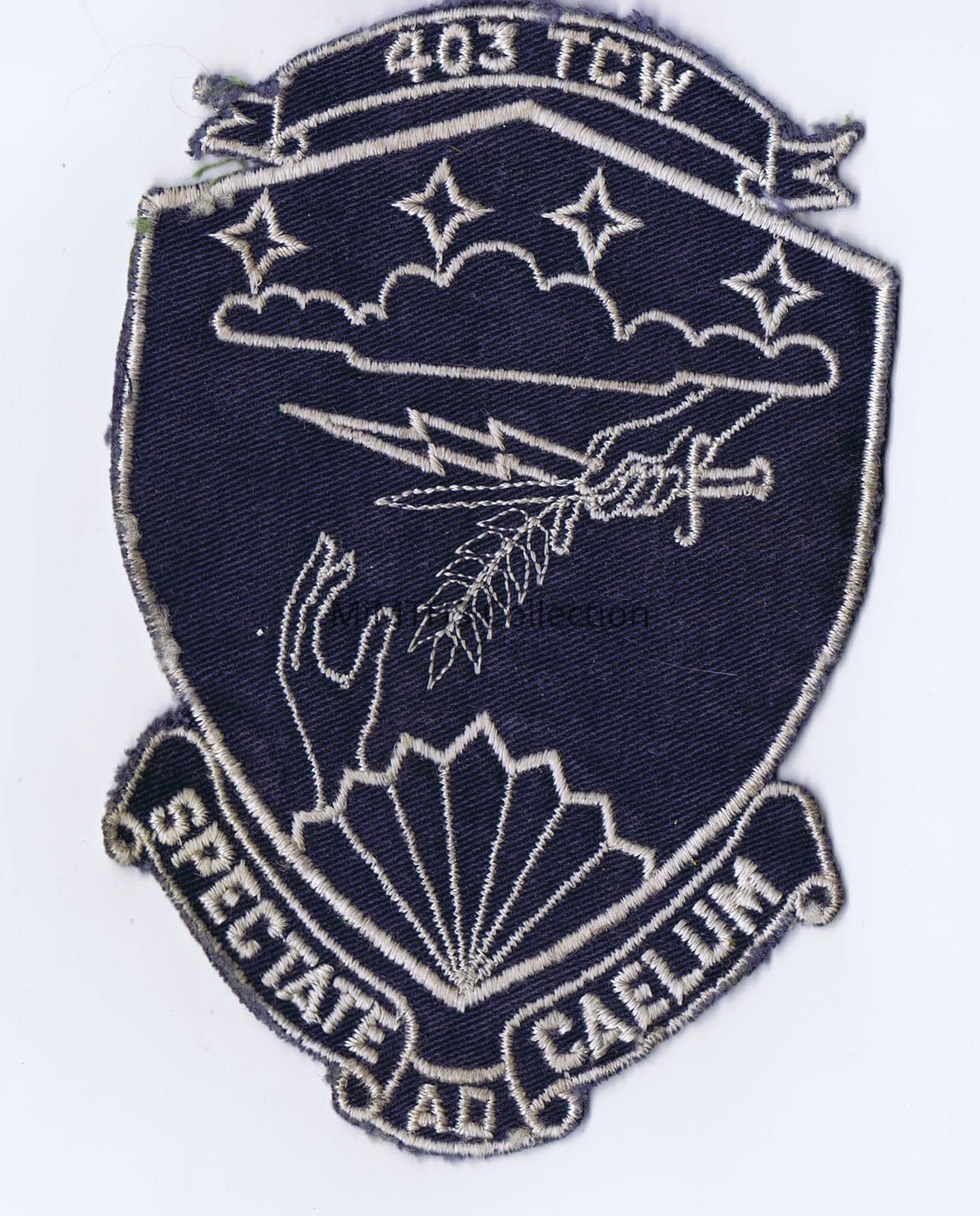 403rd Troop Carrier Wing emblem approved 9 January 1953, replaced with new insignia in 1995.