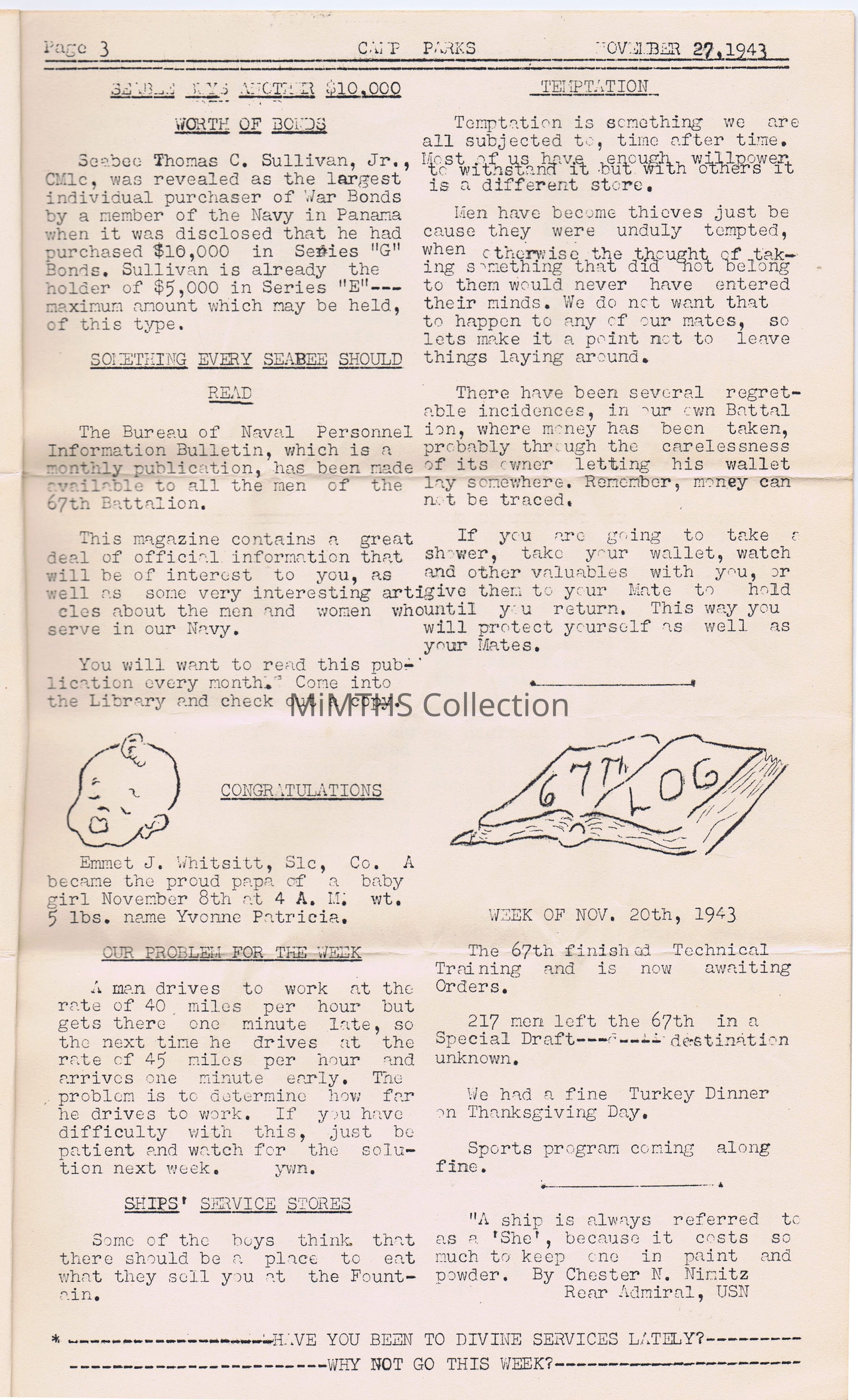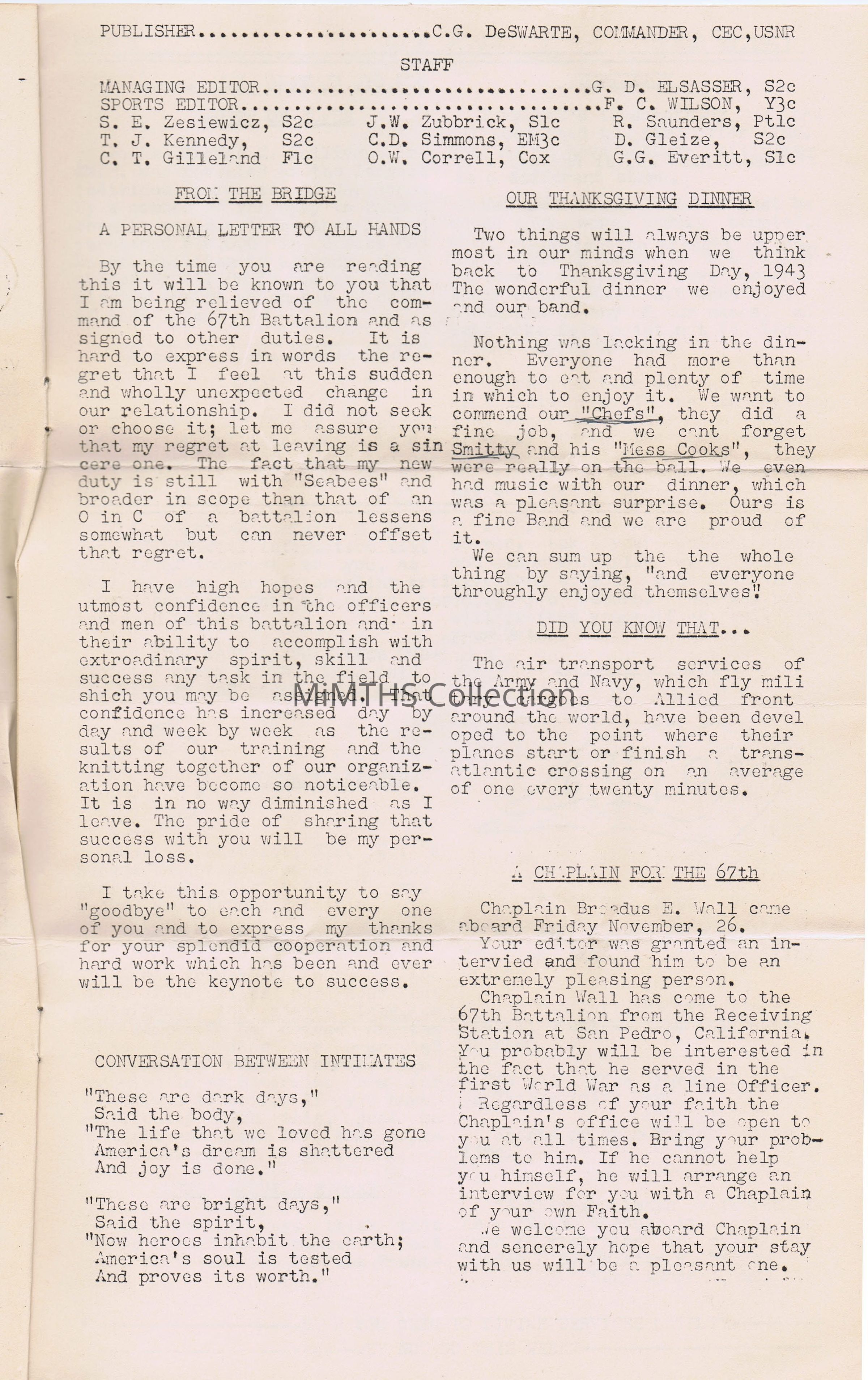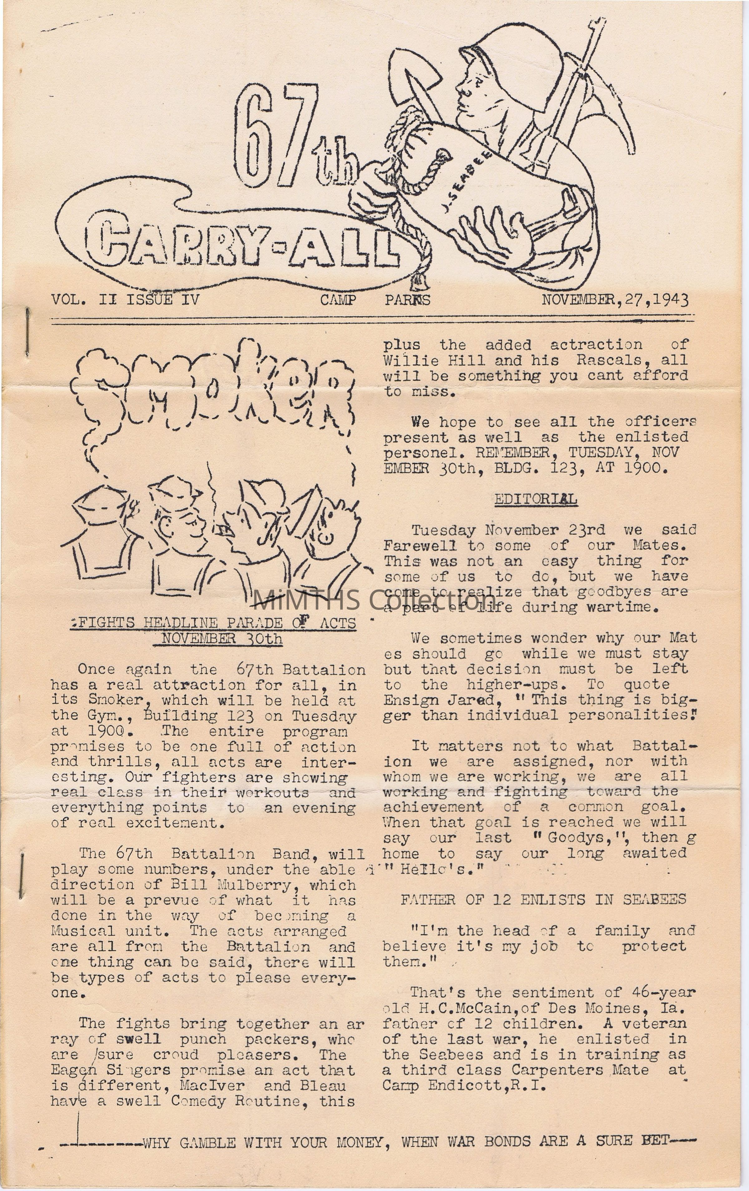 This is a newsletter for the 67th Naval Construction Battalion (Volume II Issue IV) that was issued on November 27, 1943 Thanksgiving Week.