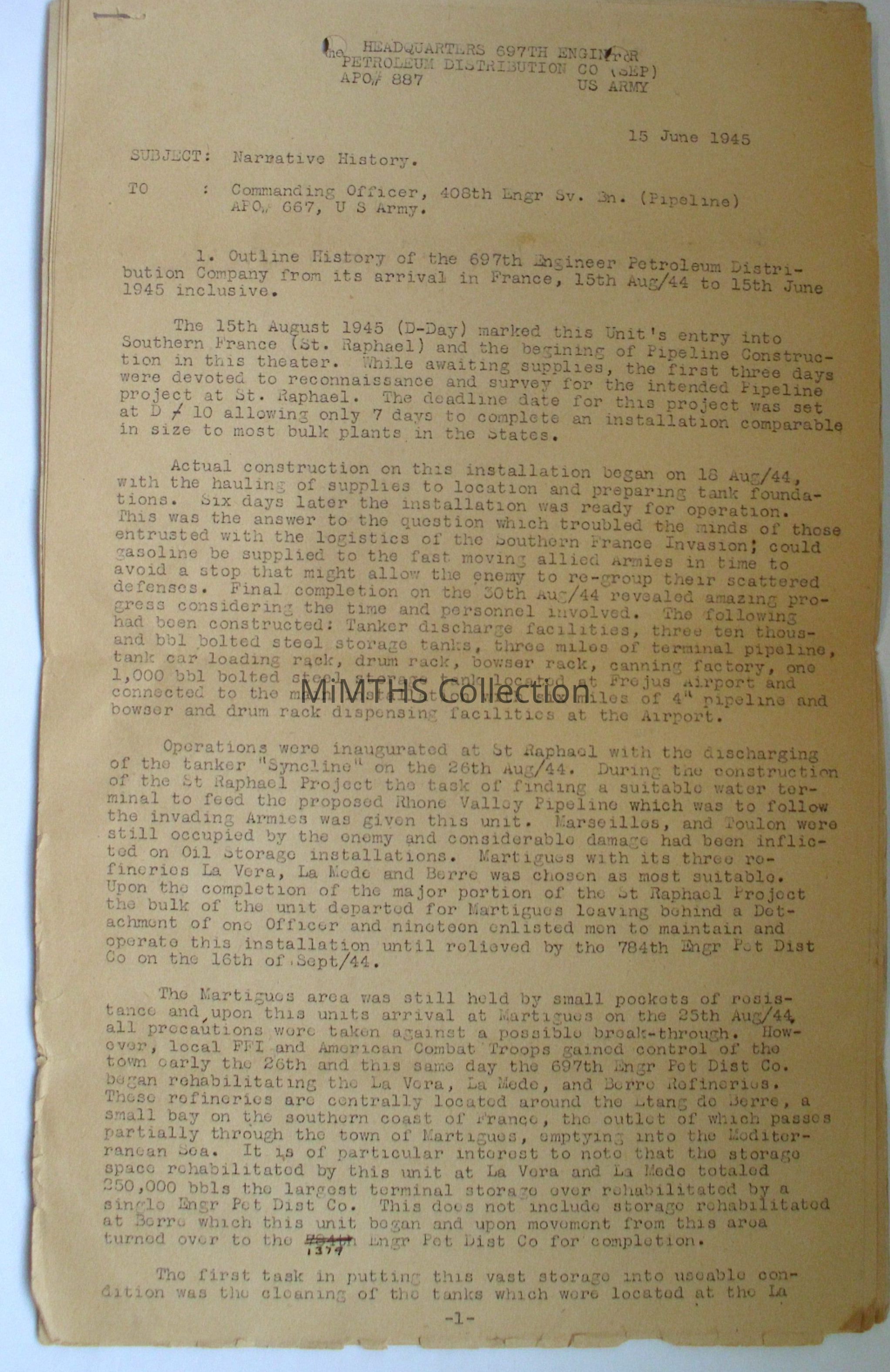 Typewritten Unit history dated 15 June, 1945 for the 697th Engineer Petroleum Distribution Company. Addressed to the CO 408 Engineer Sv.Bn. (Pipeline)