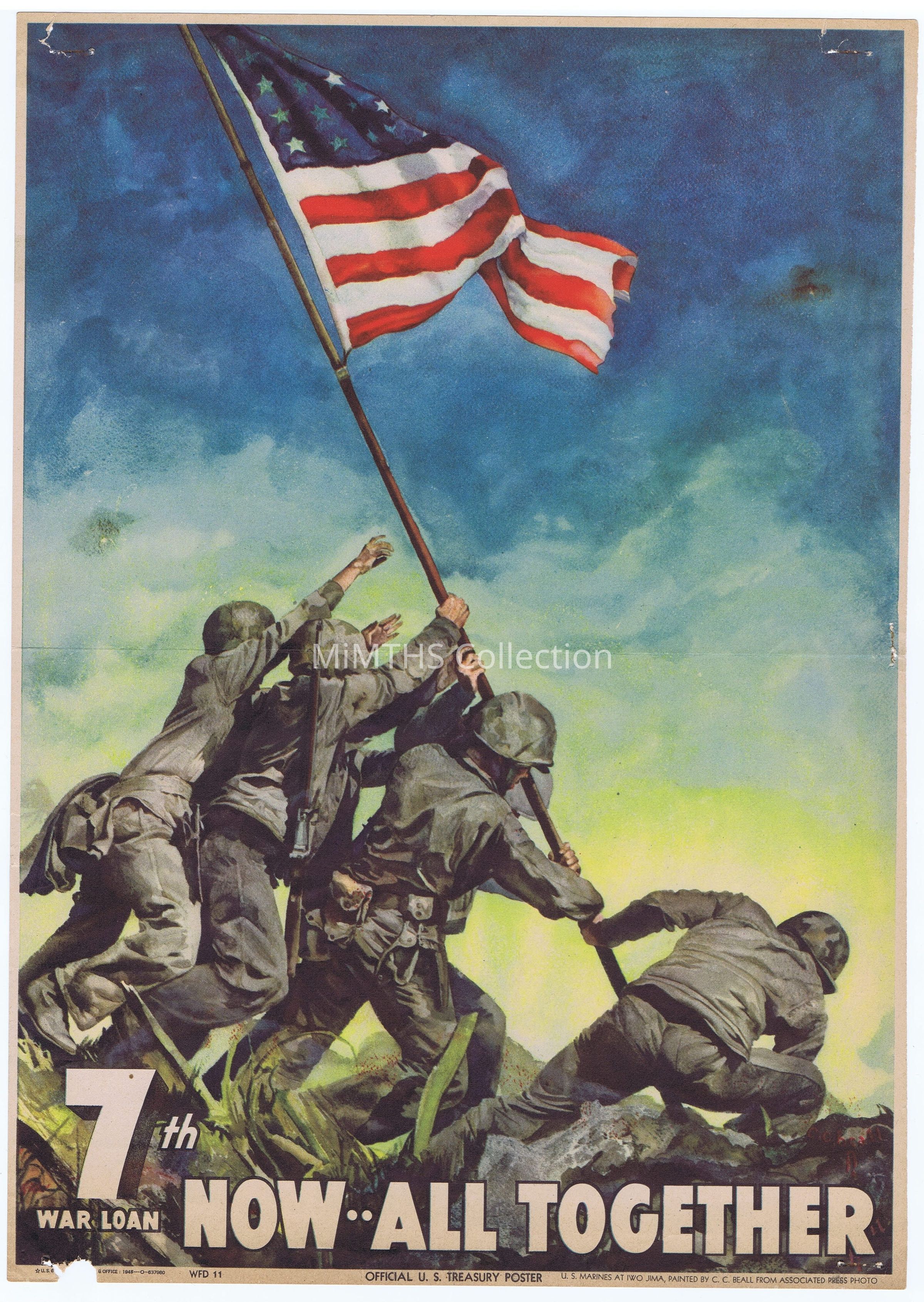 1945 Official U.S. Treasury Poster, Marines at Iwo Jima raising flag, painted by C.C. Beal from Associated Press Photo. "7th War Loan Now All Together" 13in by 9in, Office: 1945-O-666315Cataloged By