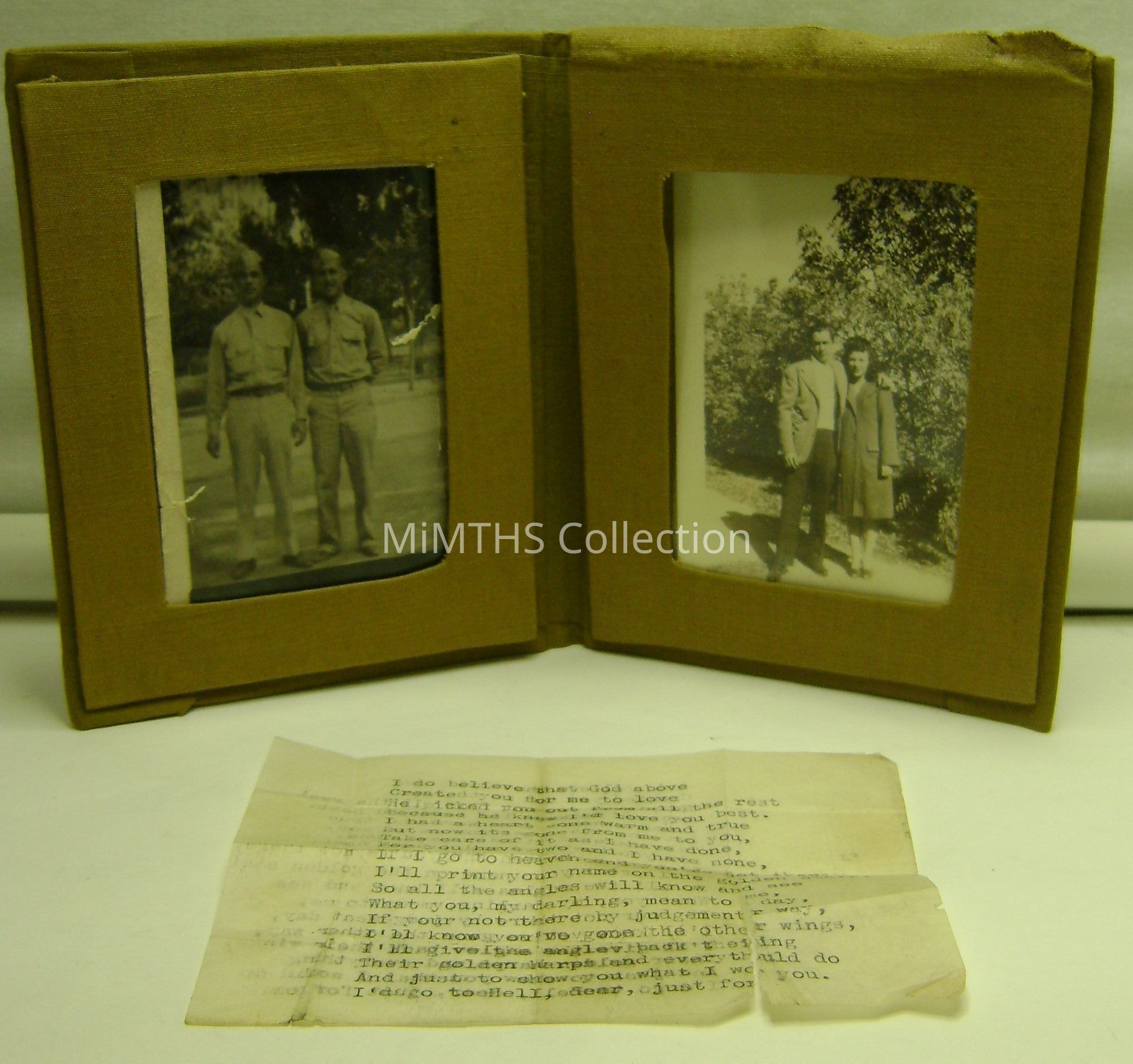 Paul Edwin Costa and Paul Crane, fellow servicemember taken in North Africa 1943. Right Robert John Costa (Brother) and Mary Helen Sheyer. (Paul's Wife) unknown date. Inside underneath the left side is a sonnet.Cataloged By
