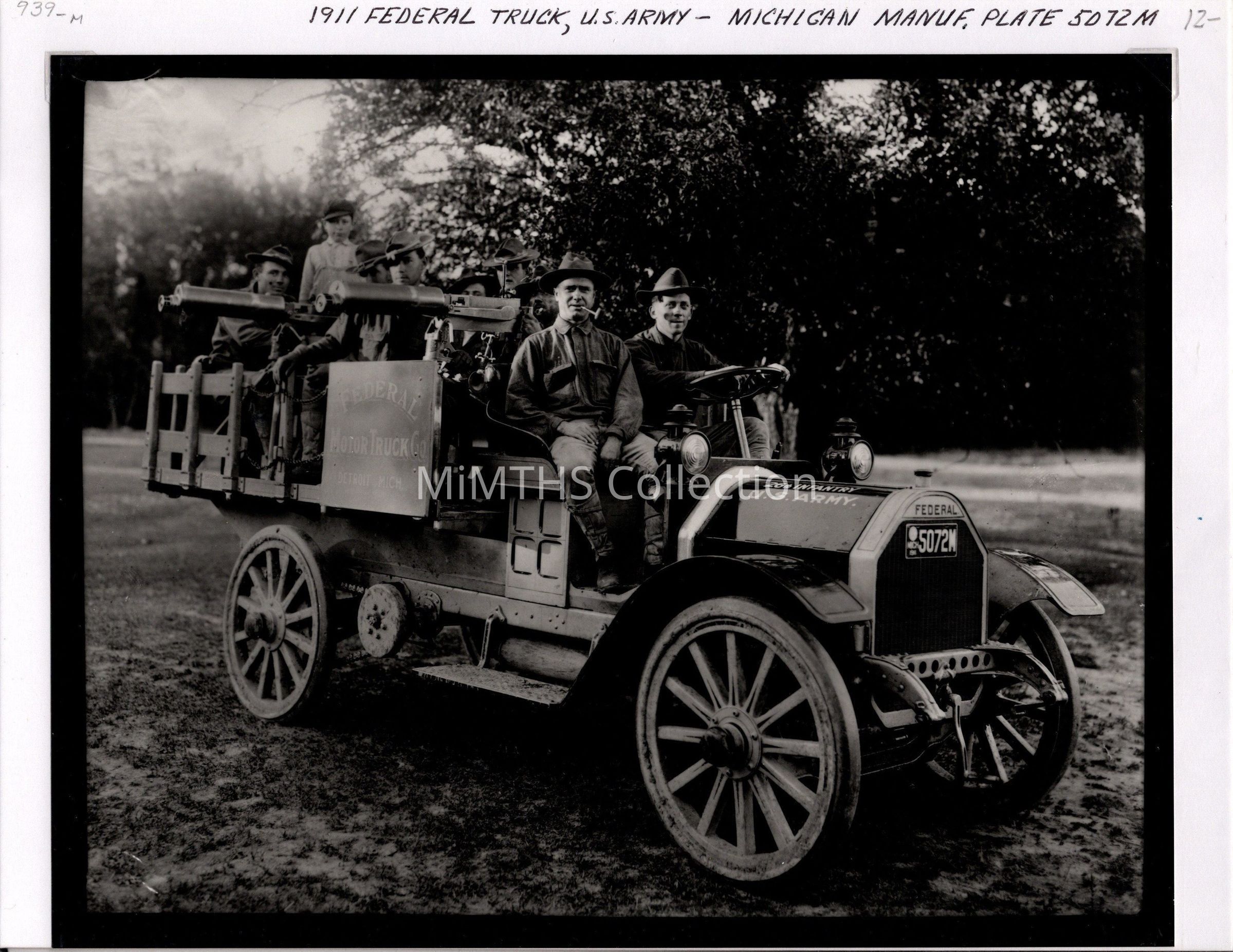 Federal Truck mounting two Maxim water cooled machine guns, Hood is marked 26th Infantry U.S. Army. The truck displays a 1911 Michigan license plate and has a sign on the side that says Federal Motor Truck Co. Detroit Mich.