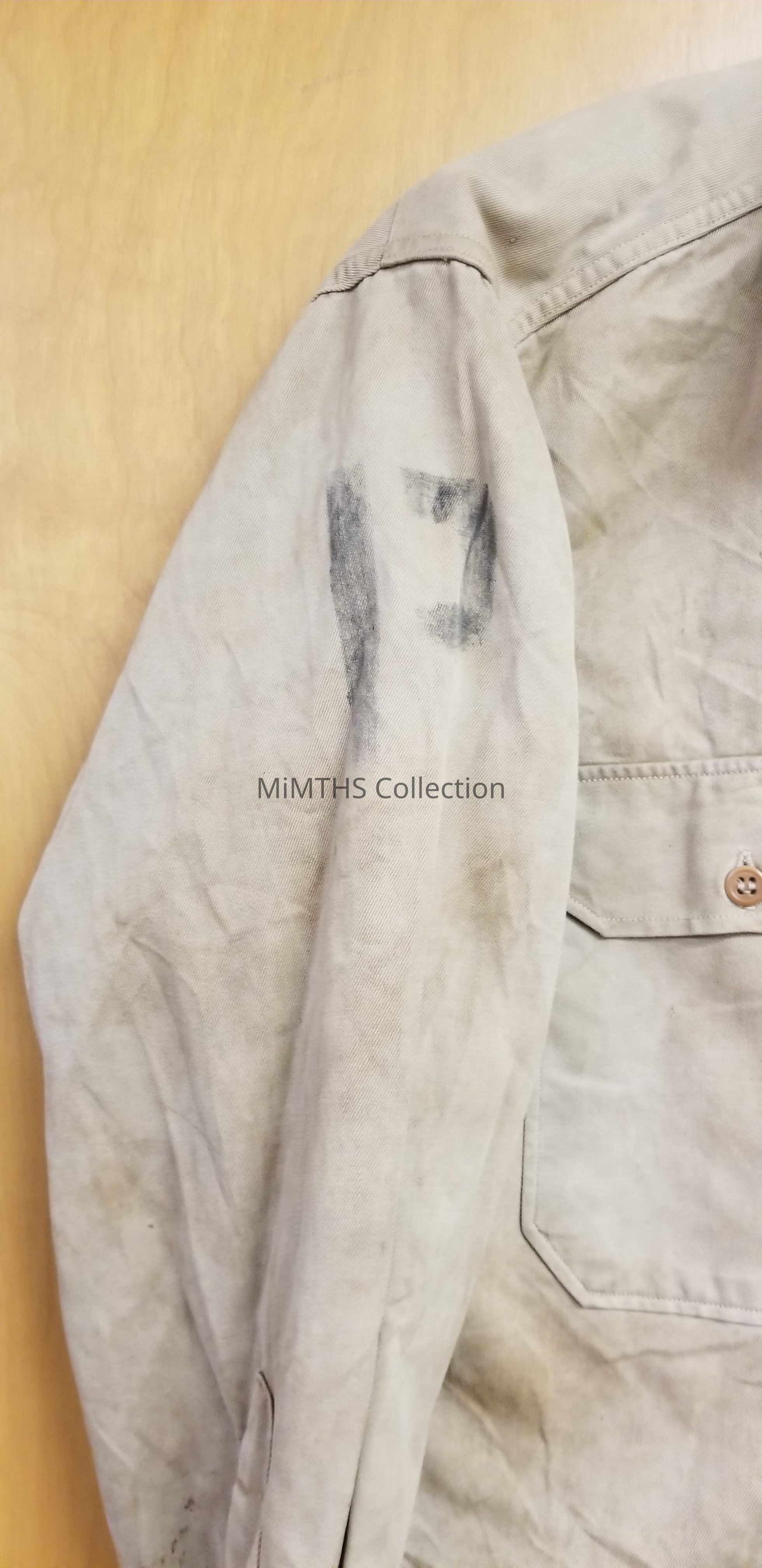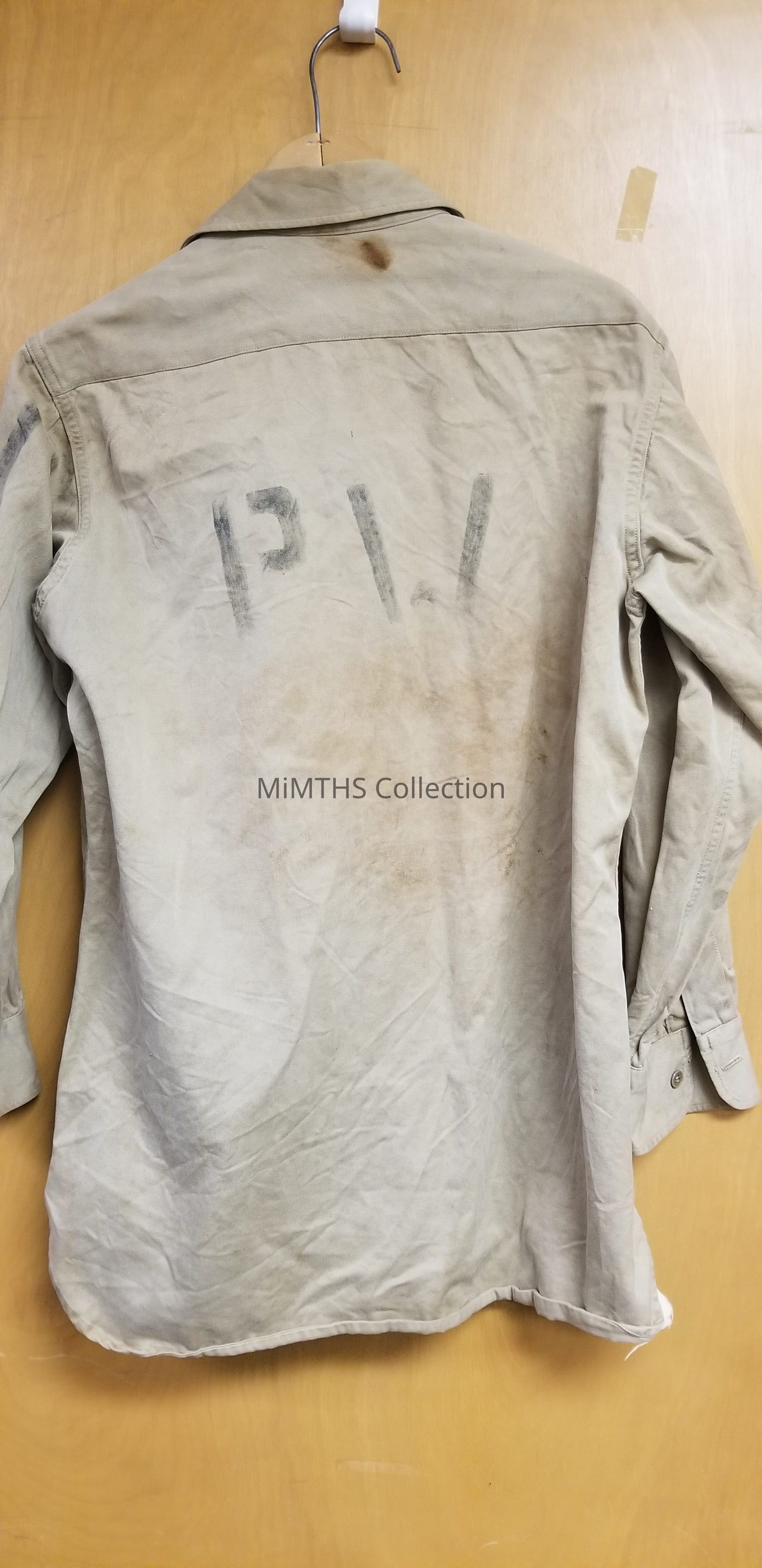 Khaki US Army long sleeve shirt with "PW" Prisoner of War stenciling on back and sleeves.Cataloged By