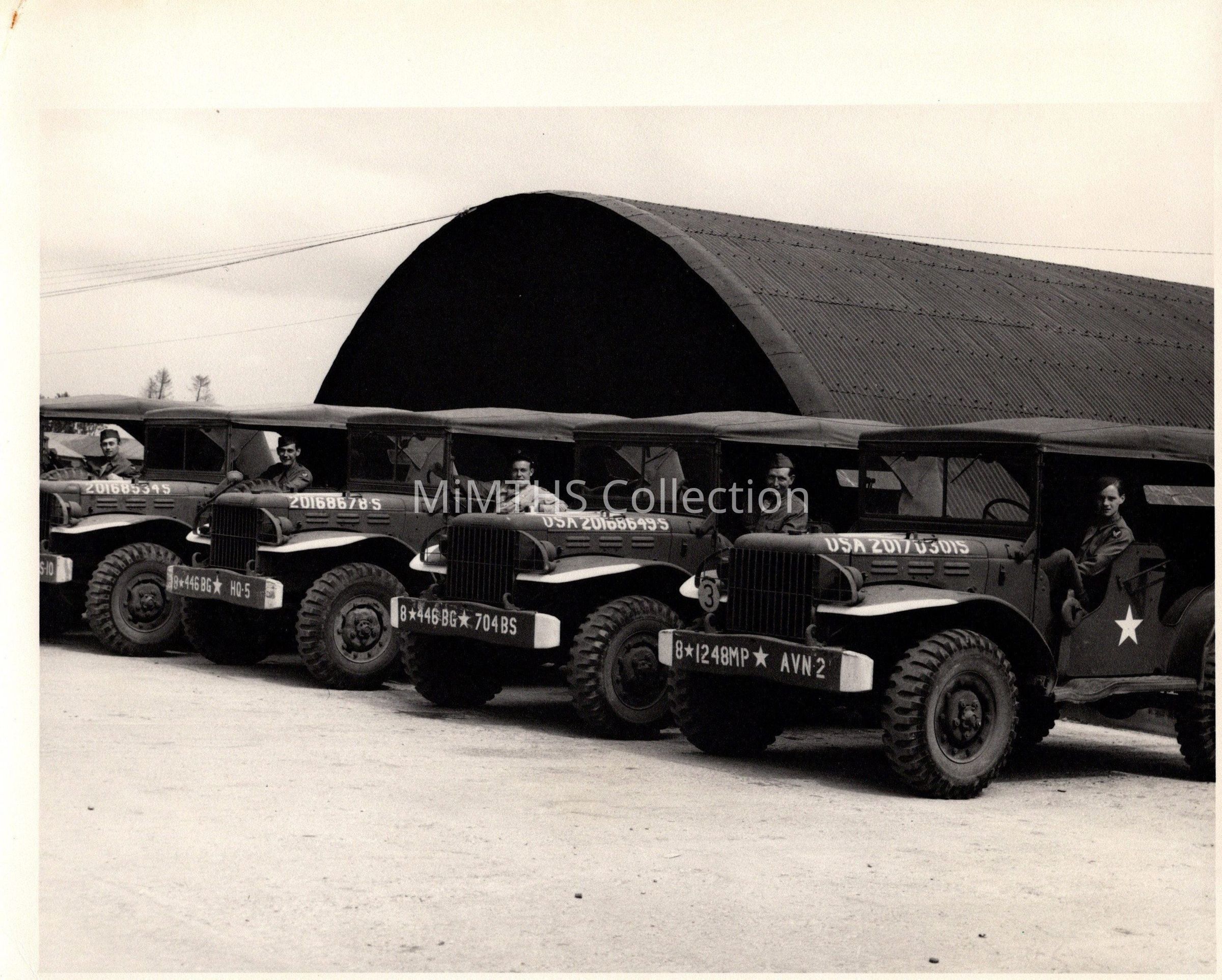Photo of 4 Dodge WC-56 command cars from the 8th Air Force. 3 are marked to the 446th Bomb Group and 1 to the 1248MP's