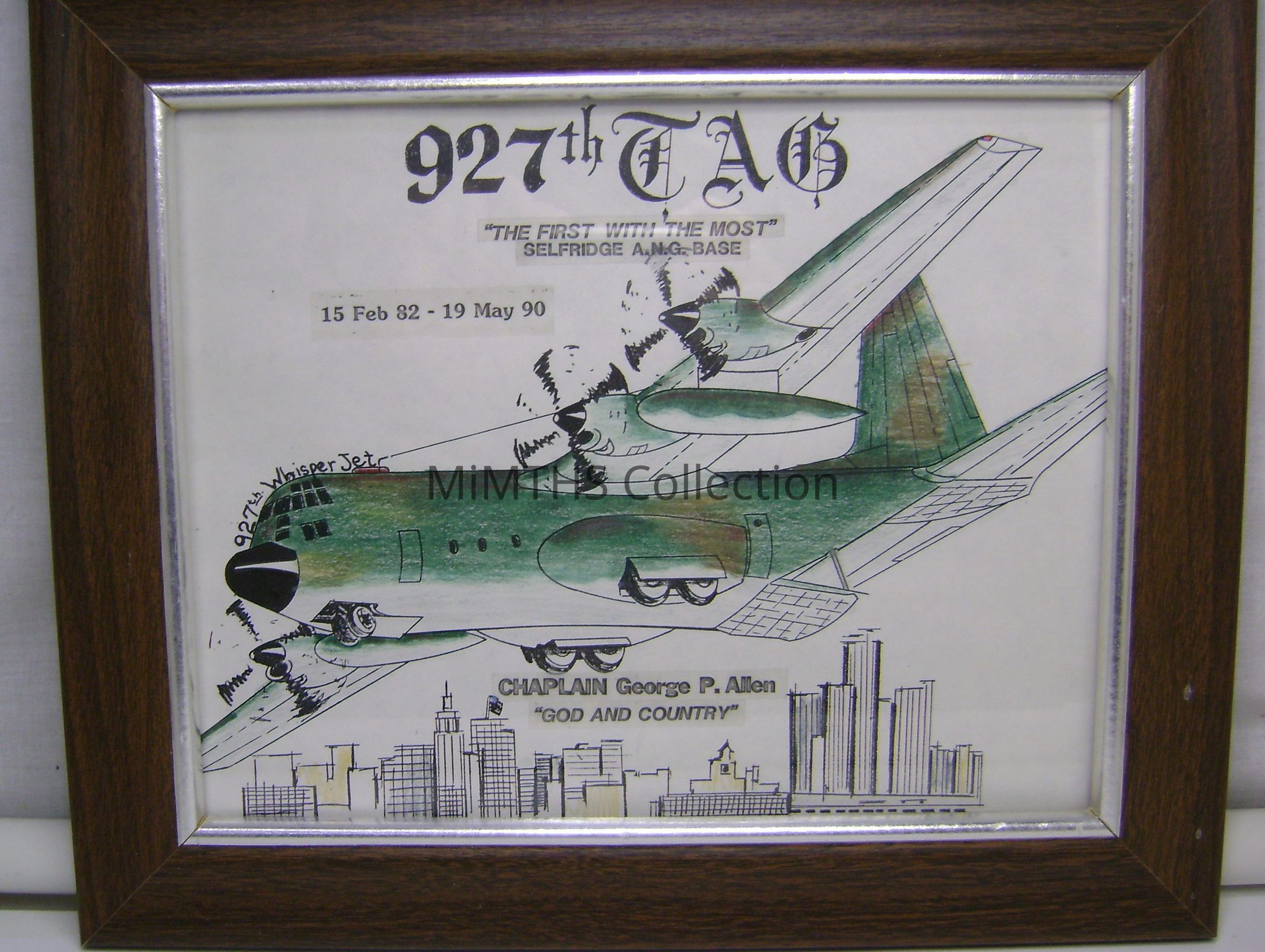 Framed artwork presented to George P. Allen. Colored pencil and fine point marker drawing of Lockheed C-139 Hercules Drawing with "927th TAG" in calligraphy, labeled "927th Whisper Jet," "'The First with The Most' Selfridge ANG Base" "15 Feb 82-19 May 90" "Chaplain George P. Allen 'God and Country'"Cataloged By