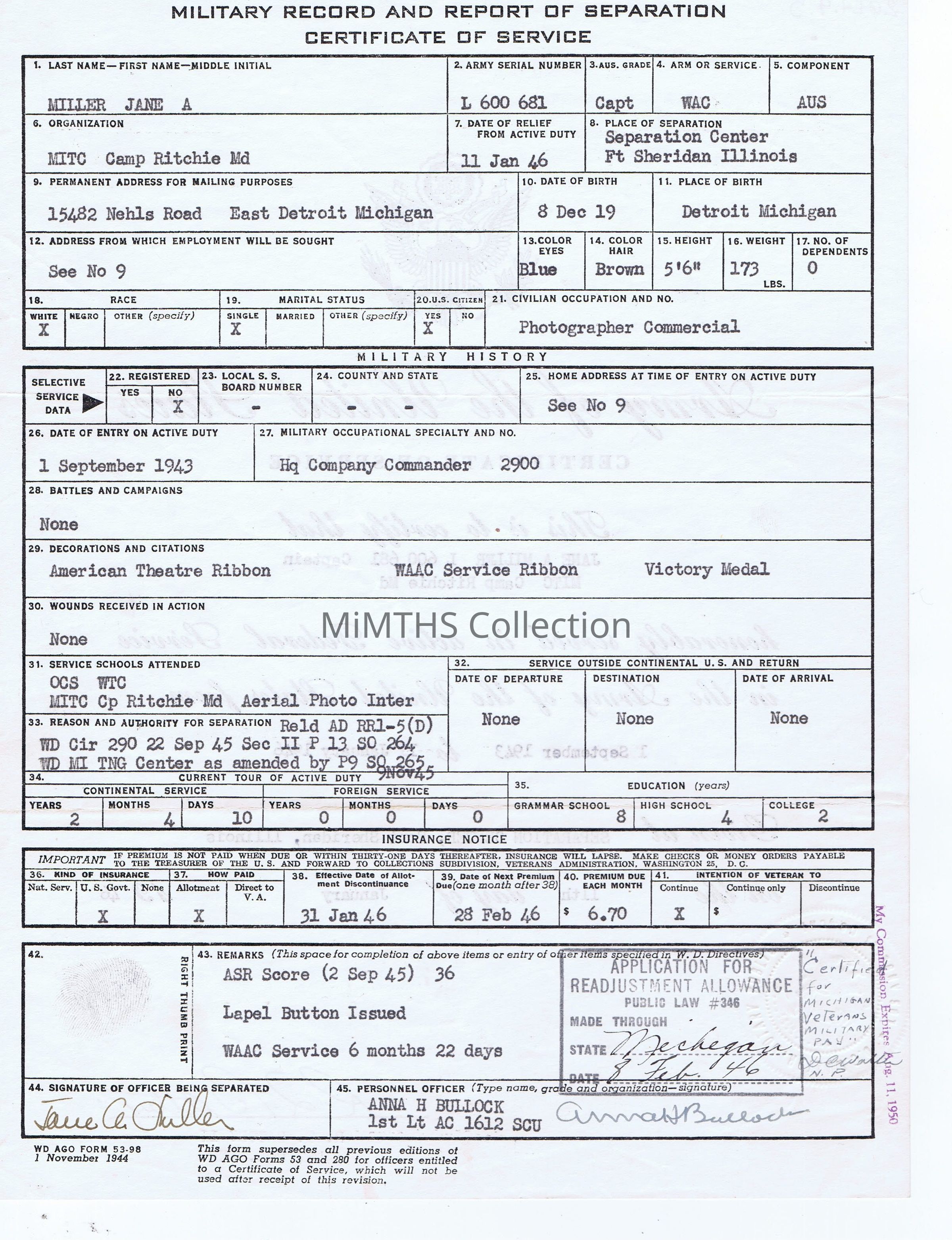 Jane Miller was an East Detroit resident who attained the rank of Captain in WWII serving as a photographic interpreter.