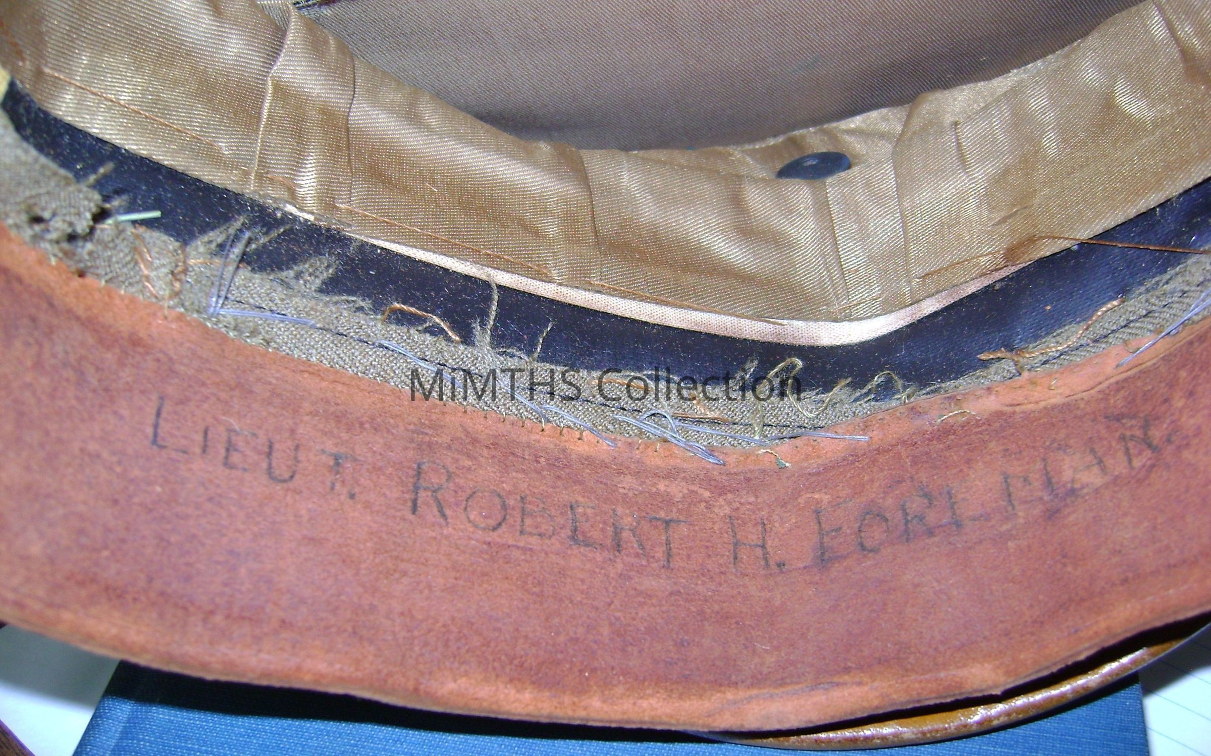 Original M1910 Officer's Visor cap belonging to Robert H. Foreman. Has seen better days, cloth band has some abrasions to it, the leather chinstrap band has snapped, there is a slice on inner lining exposing crown pad disc. Name inscribed inside on interior of sweatband. No identifiable manufacturer but it was stamped on the inside crown at one point. Size 7 1/8.Cataloged By