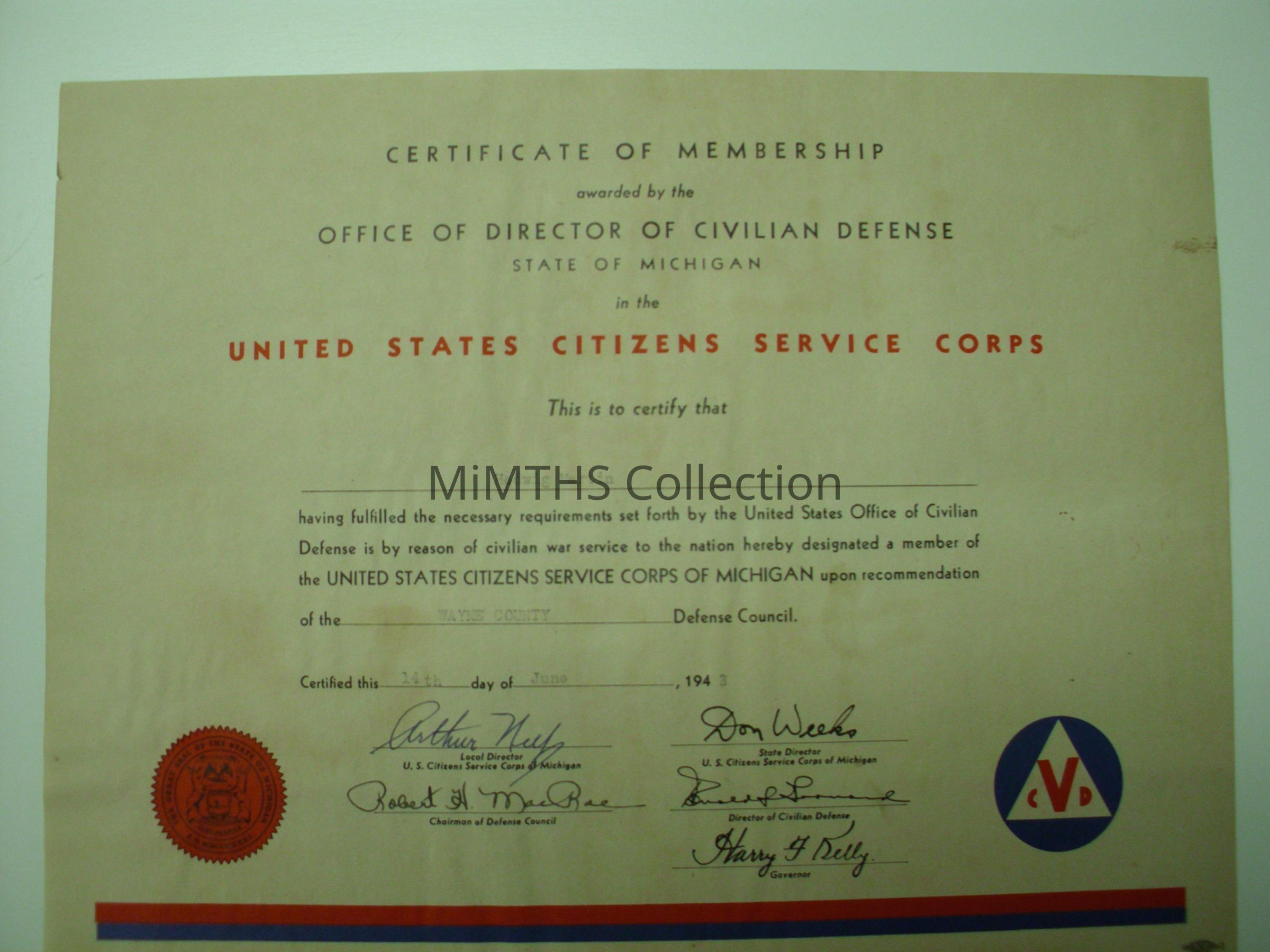 Certificate dated 14 June 1943 certifying Hedwig Martin as a member of the US Citizens Service Corps of Michigan