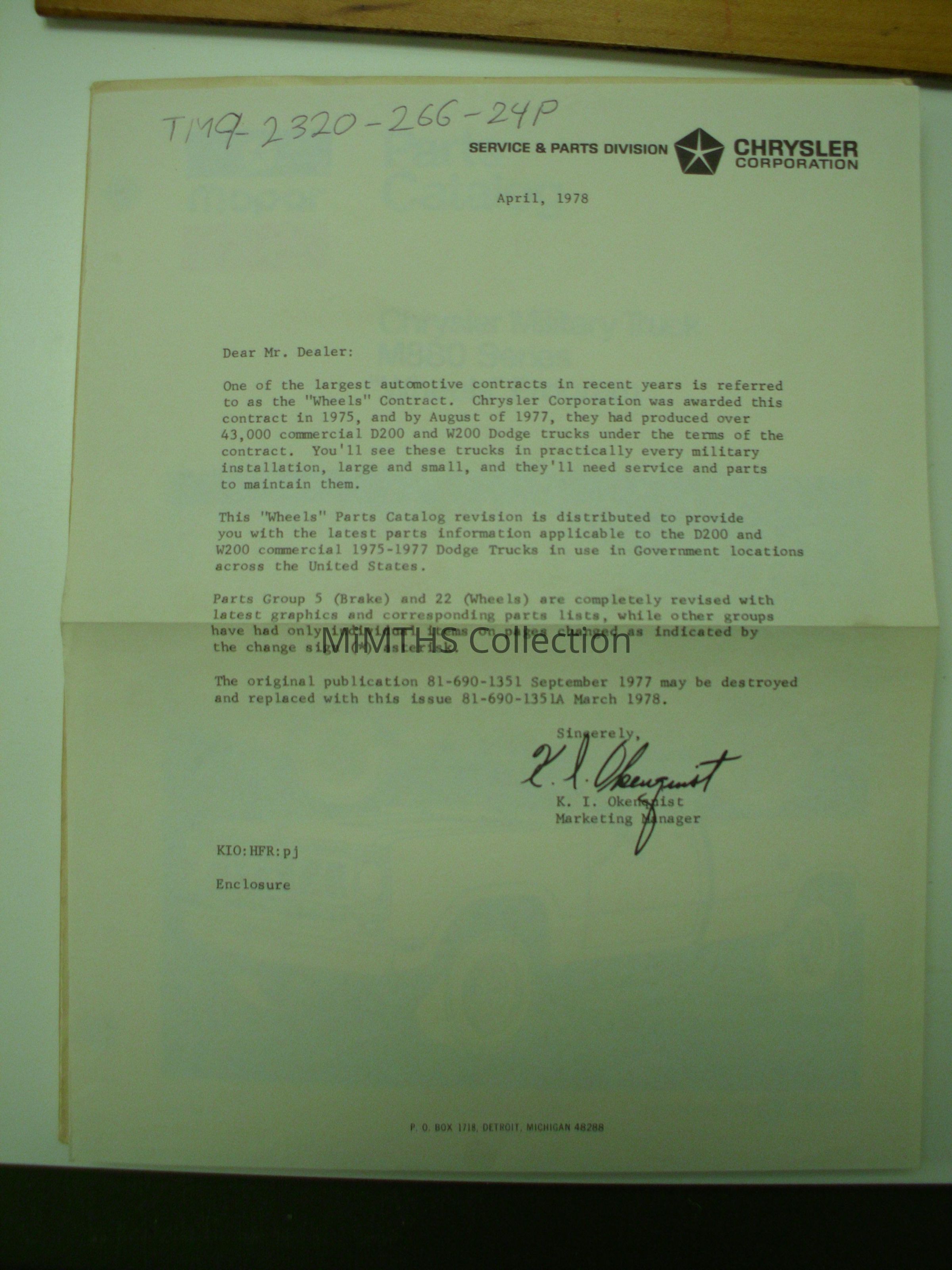 8.5x11 letter on Chrysler letterhead about the wheels program. How dealers can supply parts for the M880 trucksCataloged By