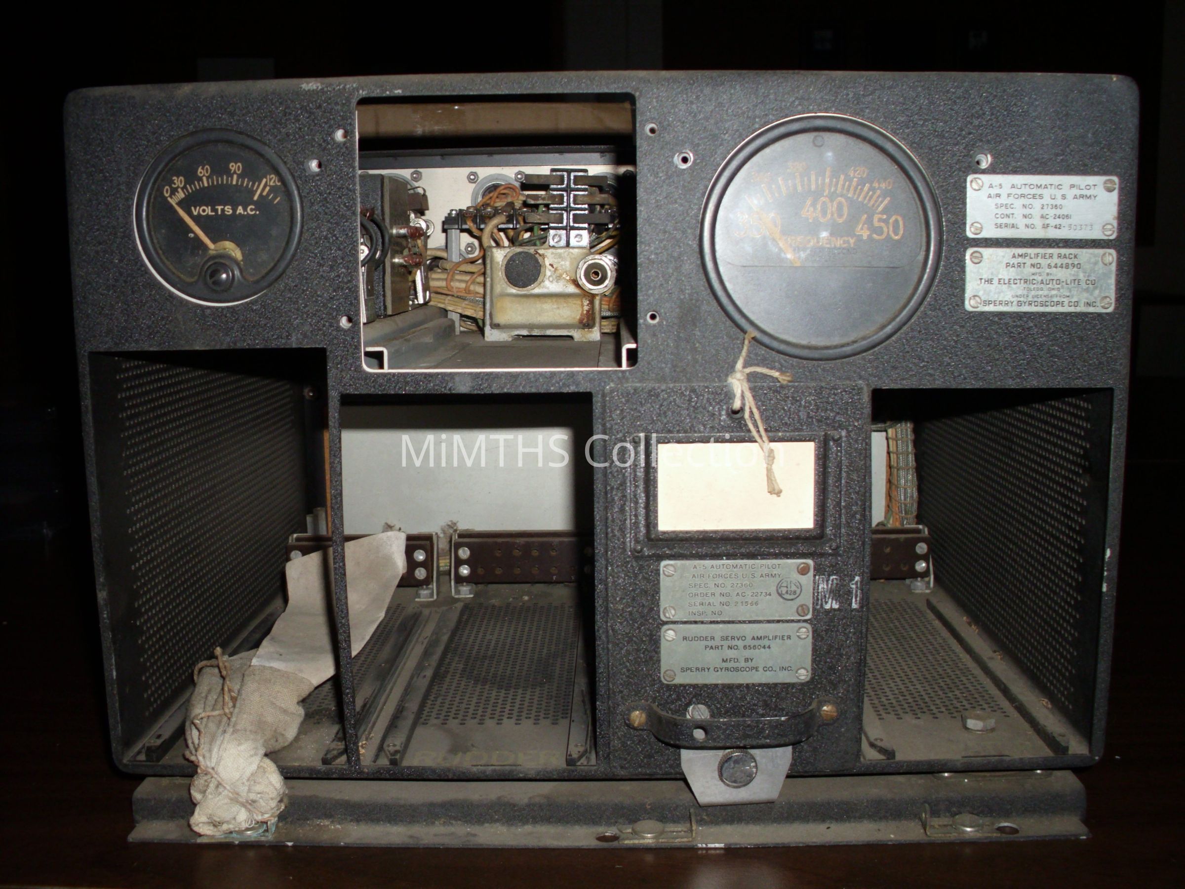 Amplifier rack fro a Sperry A-5 Auto Pilot. has 1 Amplifier in place, 3 vacant spotsCataloged By