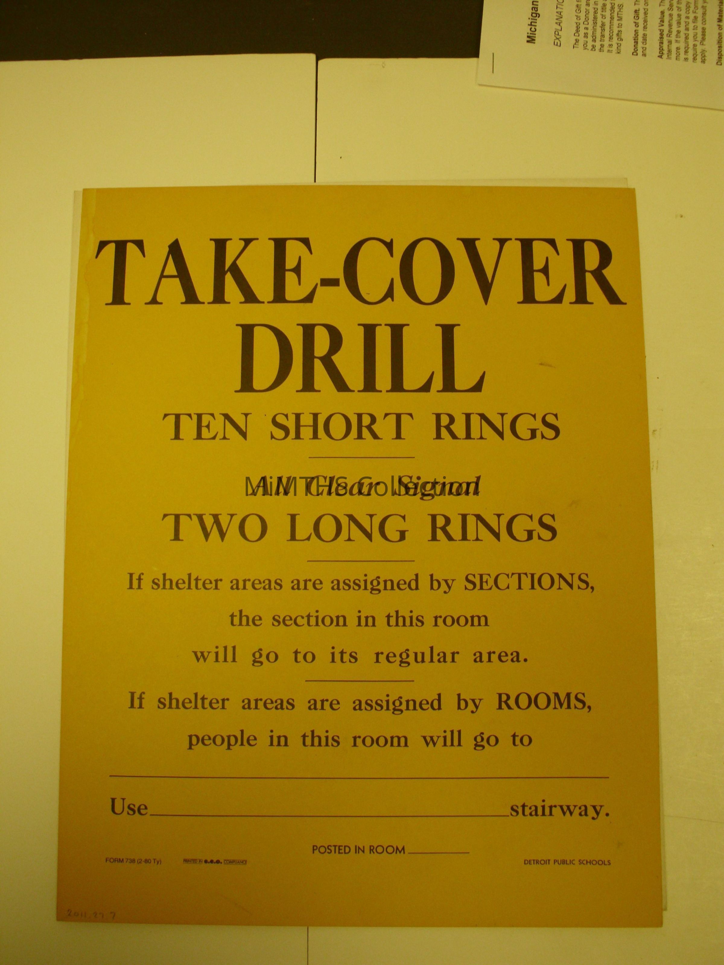 11x14 yellow cardstock poster for Take Cover drill instructions, Detroit piblic Schools, 1980Cataloged By