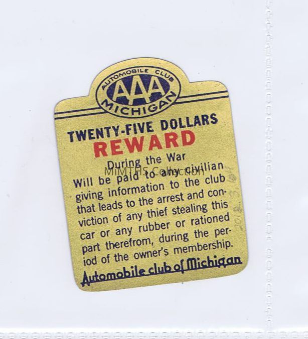 A Sticker placed in the window of a vehicle in order to deter auto or rubber theft. Issued by the AAA Automobile Club, which offered a $25 reward for information leading to the arrest of thieves.
