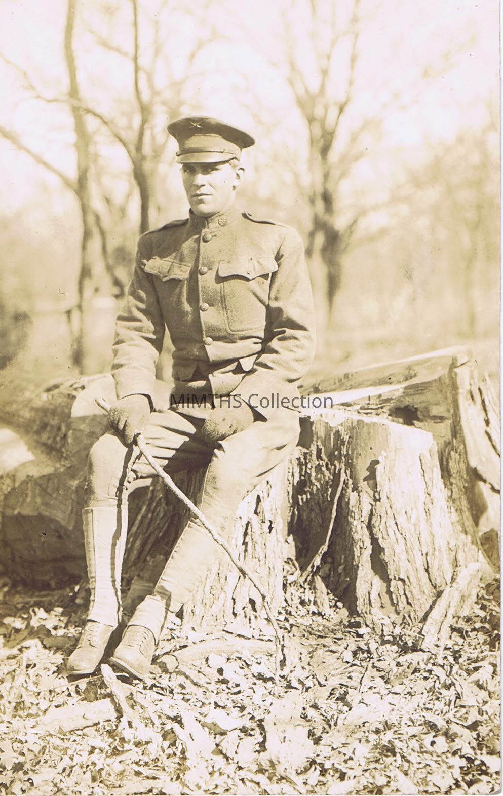This blank post card bear the photograph of an American ww1 soldier sitting on a stump in a wooded area with a stick in his hand.