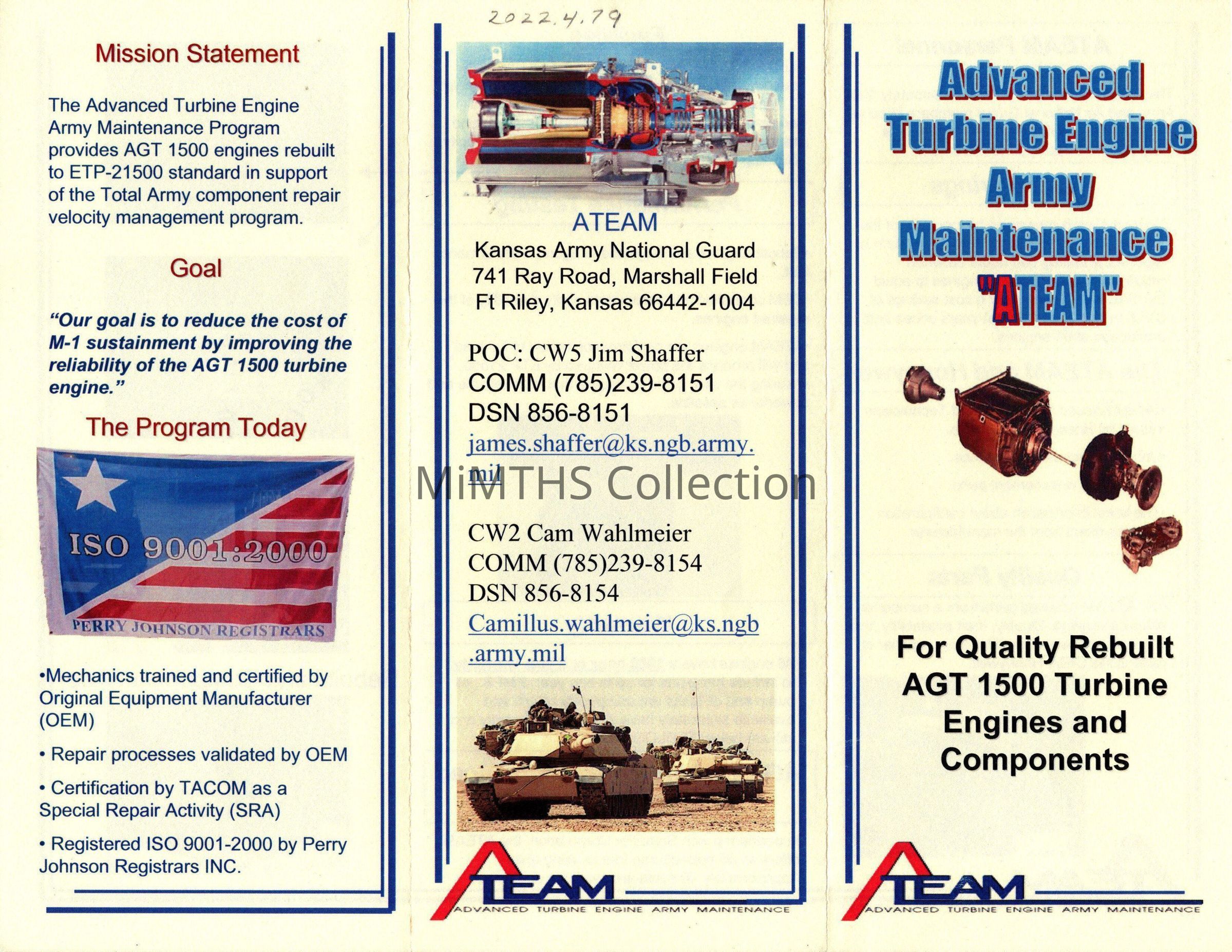 Advanced Turbine Engine Army Maintenance, ATEAM, For Quality Rebuilt AGT 1500 Turbine Engines and Components; Kansas National Guard.Cataloged By