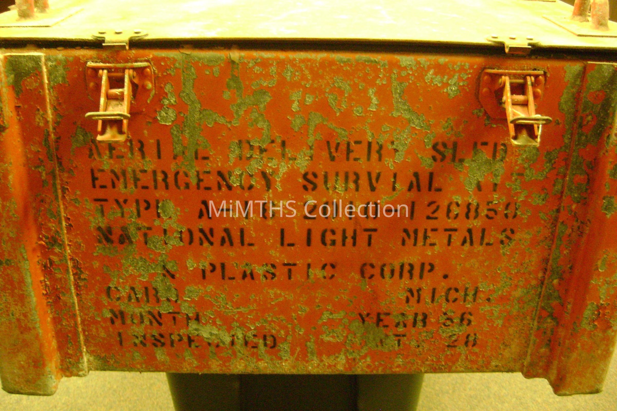 US Air Force Aerial Delivery Sled Emergency Survival Kit. Dated 1956. Type A-16. Made by National Light Metals & Plastic Corp Caro, Mich.