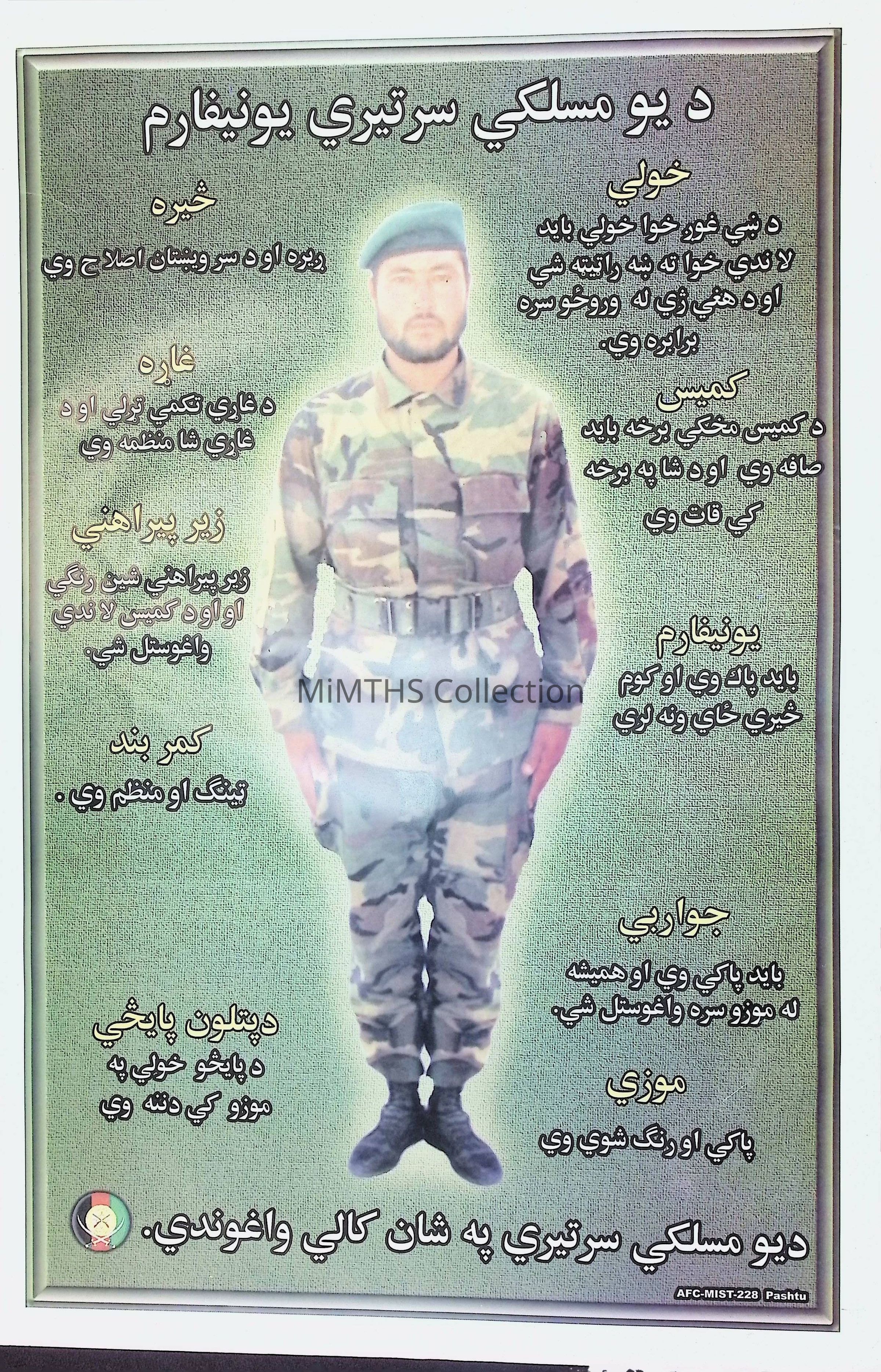 18x11.5" poster in Pashto showing the proper wear of the uniform for the Afghan National Police. Brought back from Afghanistan by SFC Steve Mrozek