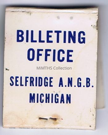 A phone number is printed across the top fold 313-463-9090 from "BILLETING OFFICE SELFRIDGE A.N.G.B. MICHIGAN". The matchbox was graphically designed by the William P Froling Company, an advertising company founded by WWII Pacific navy Veteran William Froling of Warren, MICataloged By