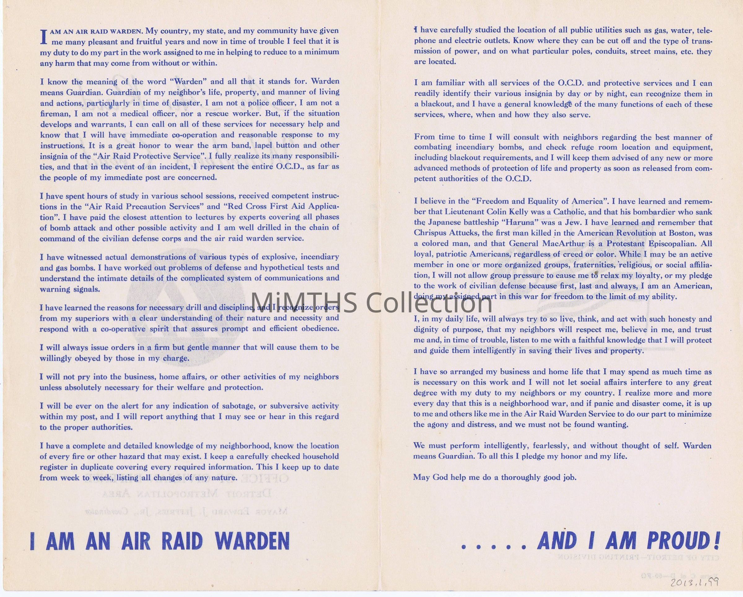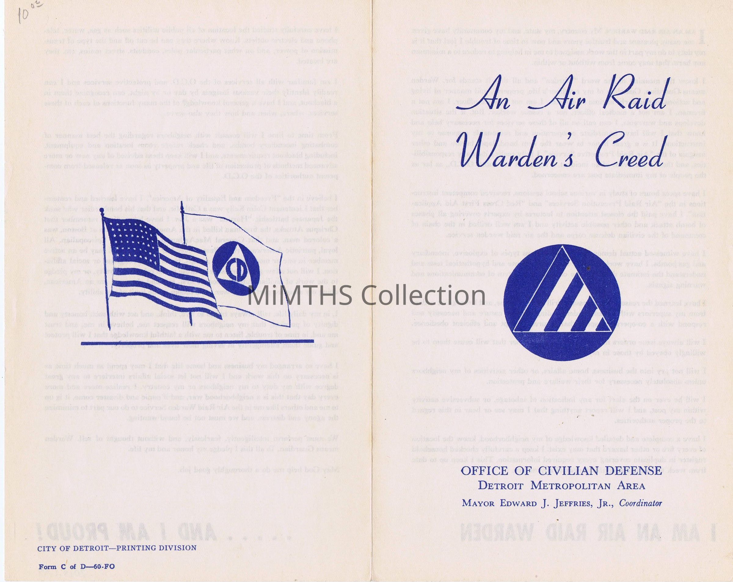 8.5x11 folded booklet from the Office of Civilian Defense, Metropolitan Detroit Area with the Air Raid Wardens Creed.