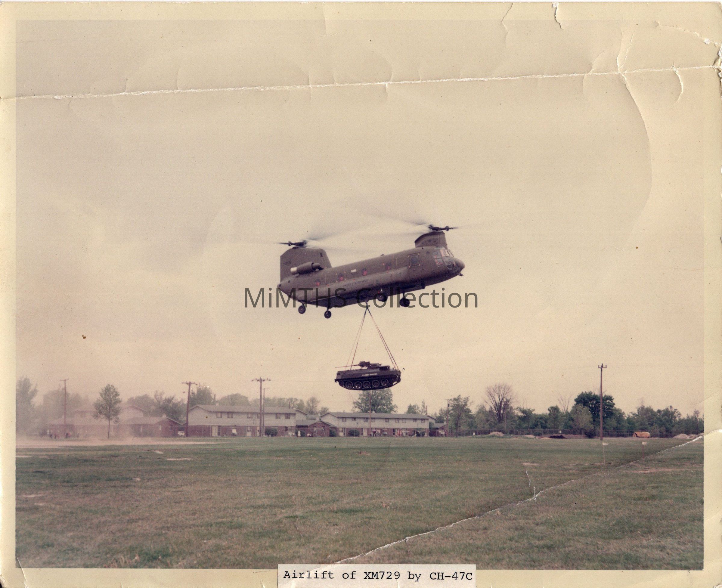 8x10" glossy of an XM729 being lifted by a CH47C.