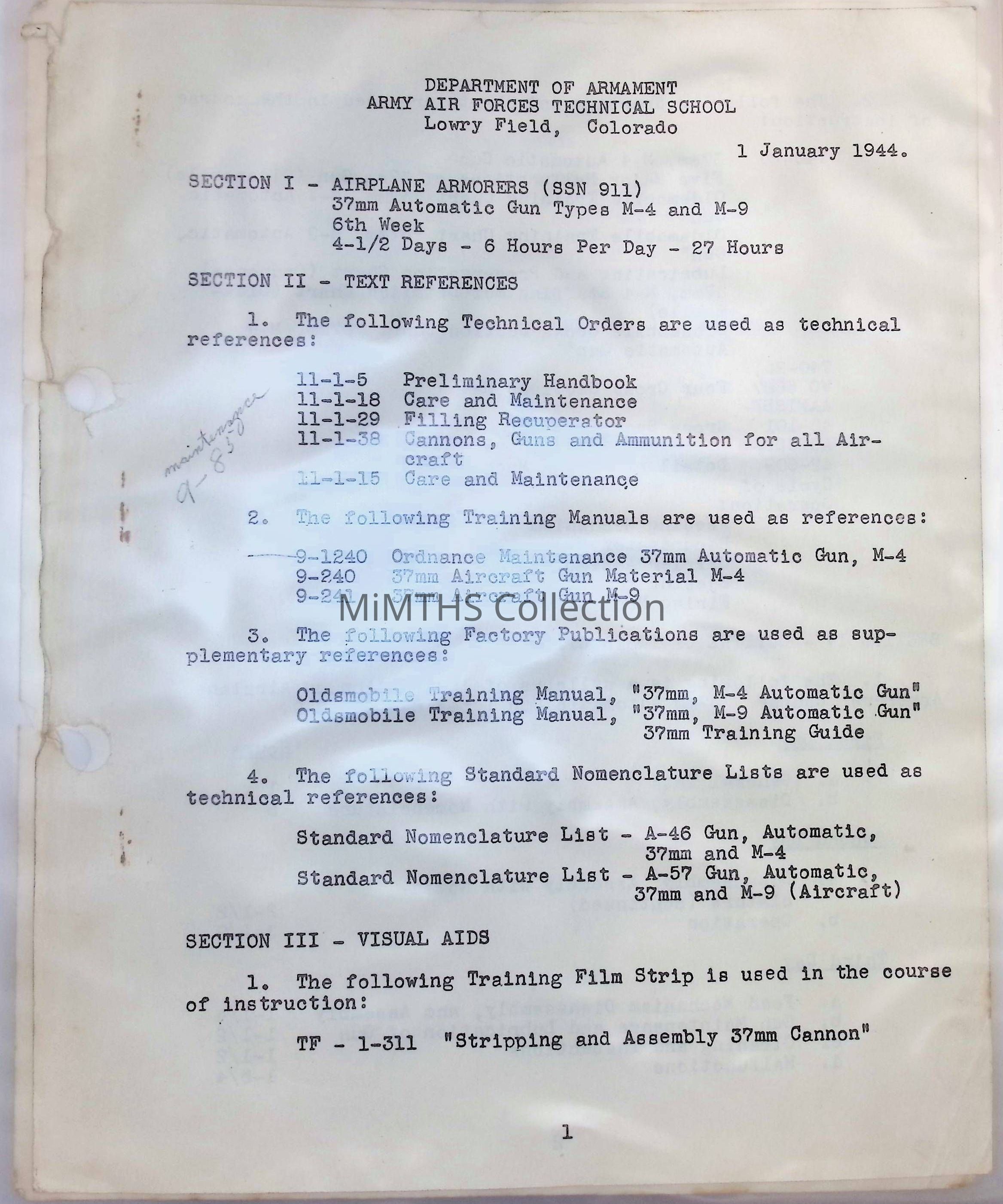 Department of Armanent Army Air Forces Technical School Lowry Field, Colorado. Airplane Armorers (SSWN 911) 37 mm Automatic Gun Types M-4 and M9.Cataloged By