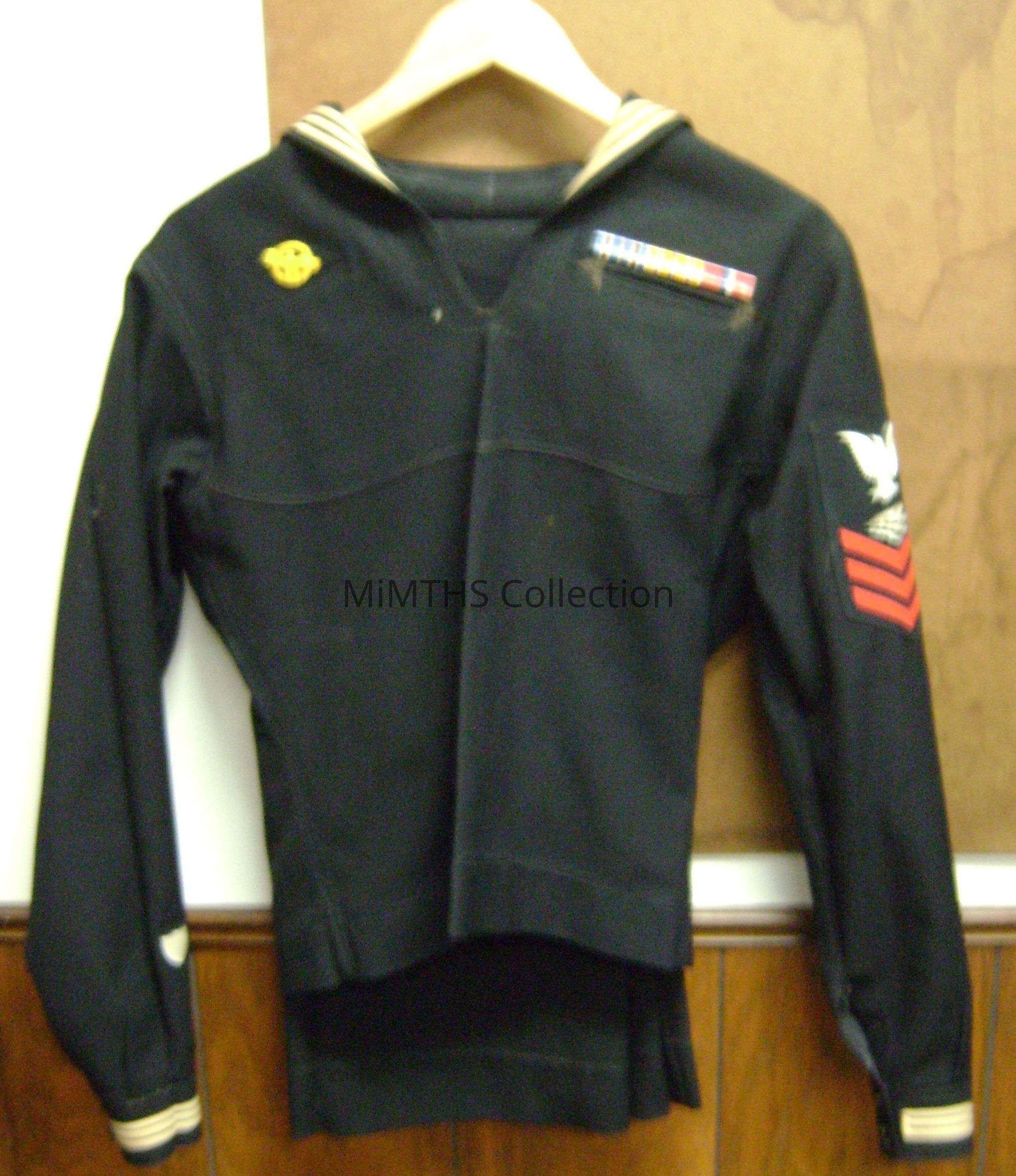 Albert Kopack's original blue service uniform worn aboard the USS Menkar. This shows his Radioman 1st class patch on the left arm, his service ribbon bar showing: American Campaign Medal, Asiatic/Pacific Campaign Medal, and Philippine Liberation Medal. Along with eagle service patch. The uniform is in good condition for its age. This ribbon bar is a replacement reproduction acquired later.