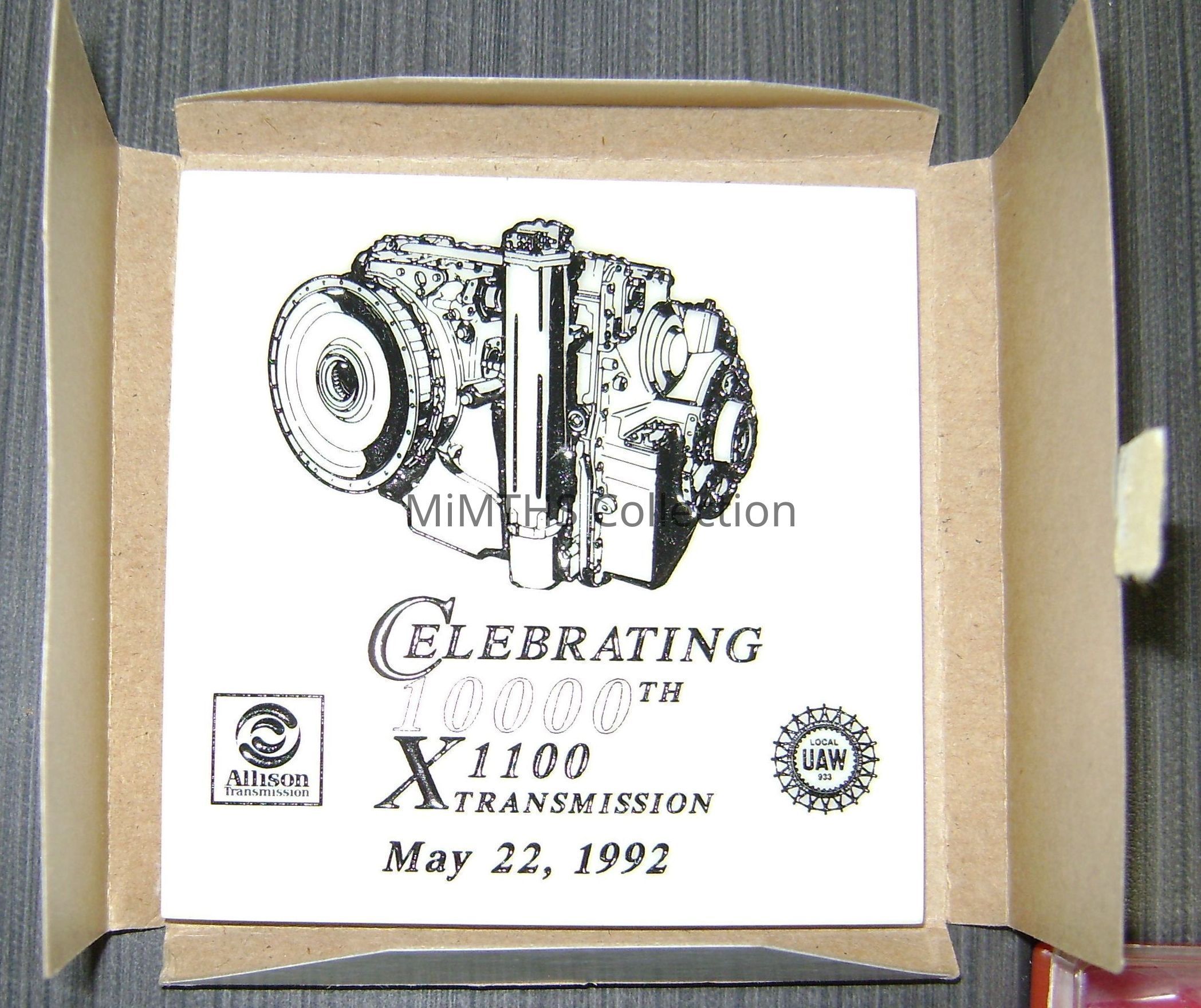 Drink coaster commemorating the 10,000th Abrams X1100 Transmission manufactured by Allison Transmission May 22, 1992.