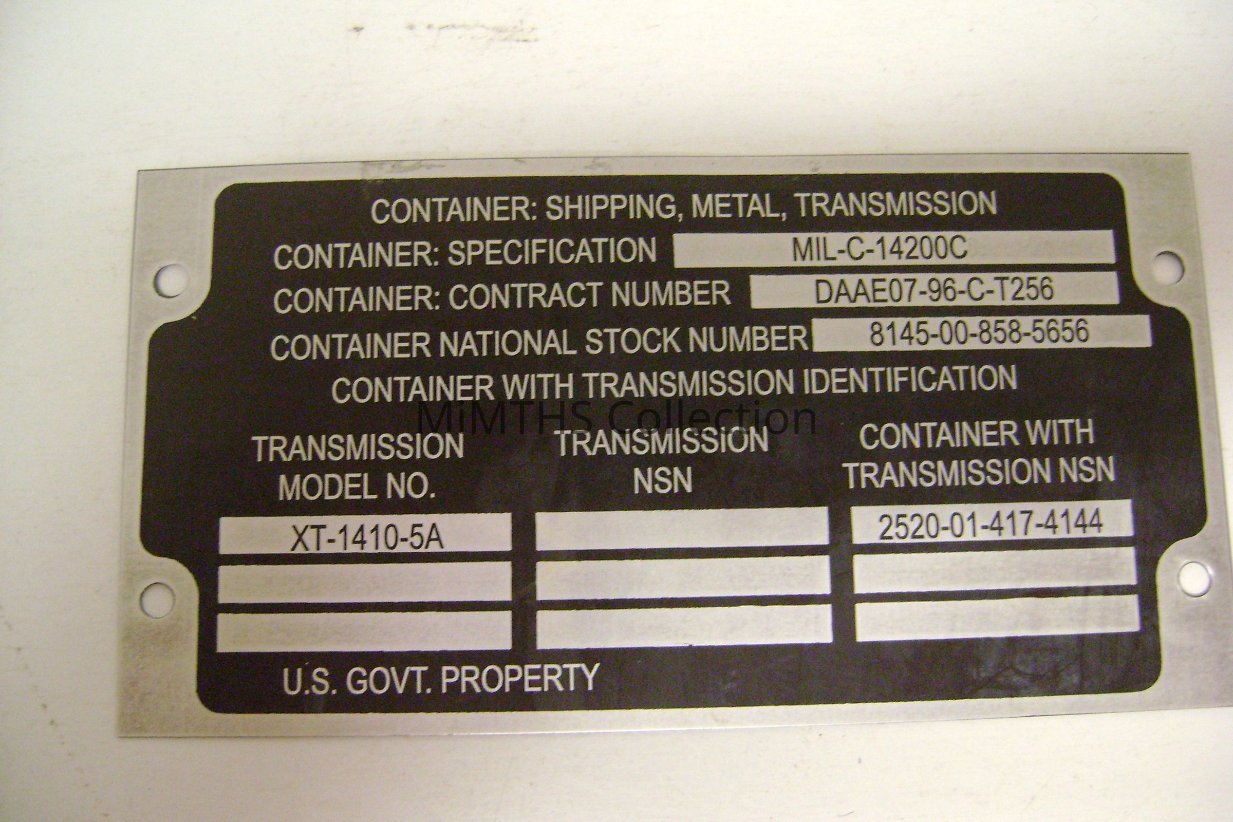 Data plate for an Allison XT1410-5A transmission. (M88 Recovery Vehicle)