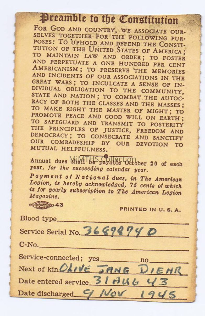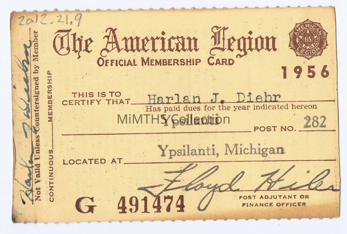 Official American Legion Membership Card belonging to Harlan J Diehr of Ypsilanti. Also signed by Floyd Hiler. Service Serial number on back 36878740, Next of kin Olive Jane Diehr, served 31 Aug 43-9 Nov 45Cataloged By