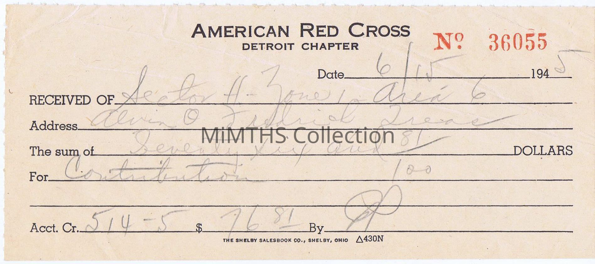 Confirming the details of a check by a Mr. Alvin O. Fredrick to the Red Cross to the order of Seventy Six Dollars and Eighty One Cents on June 15th, 1945.Cataloged By