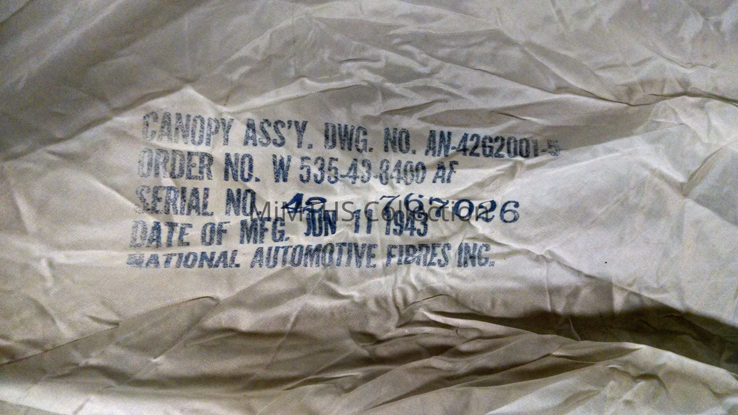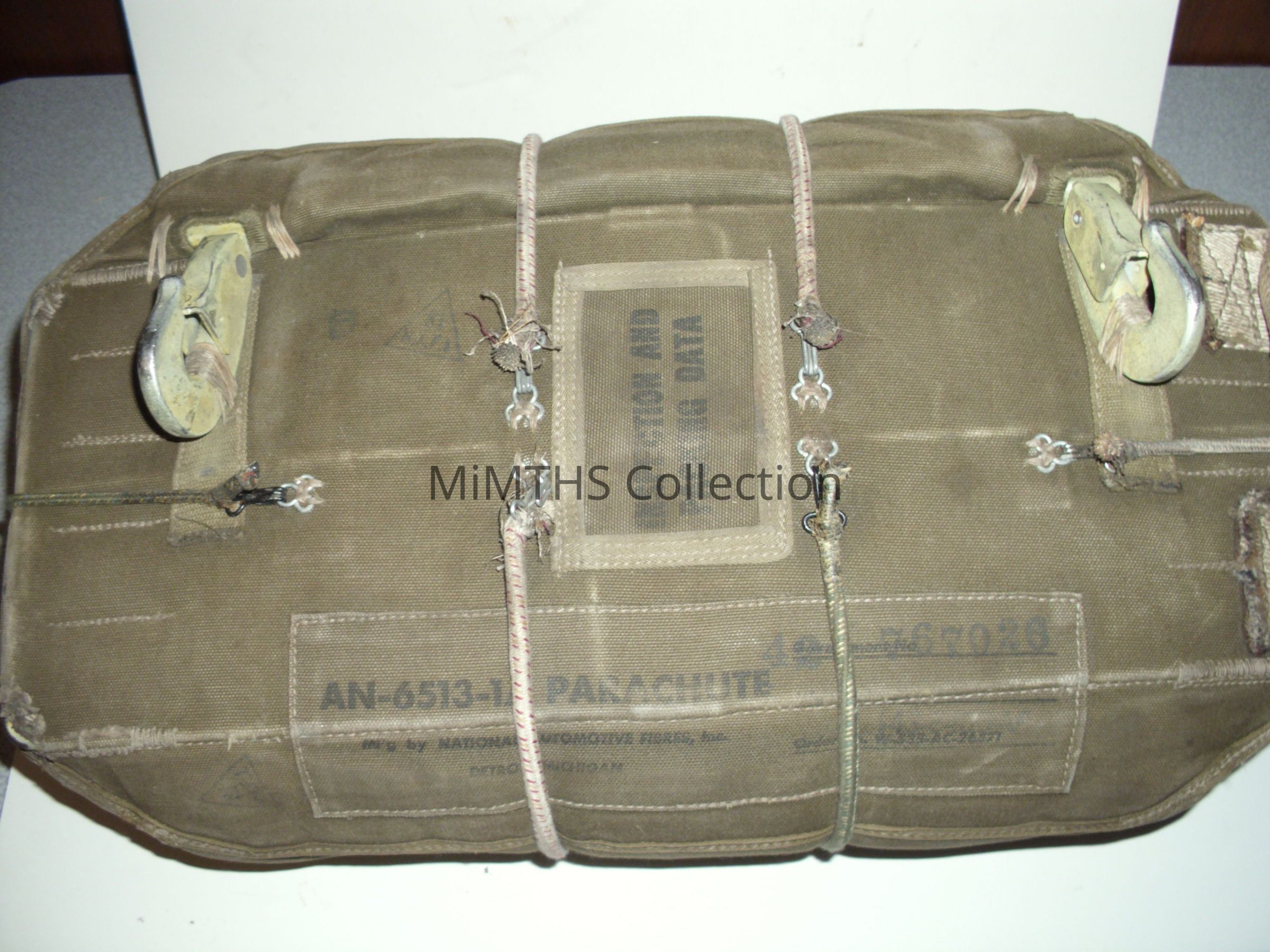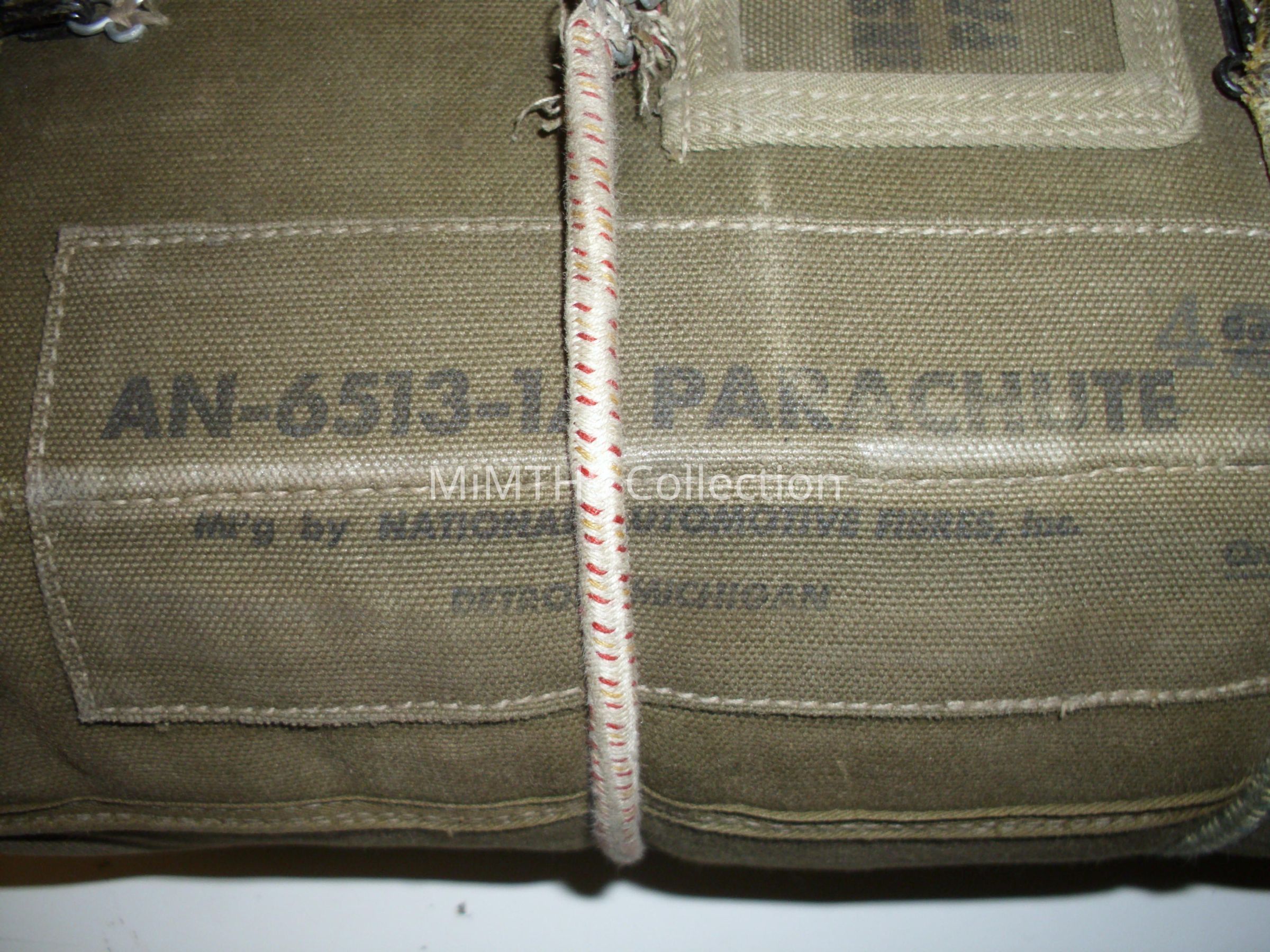 AN6513-1A parachute made by National Automotive Fibres Co of Detroit. This is a "red group" chest pac for the QAC rig worn by bomber crews.Cataloged By