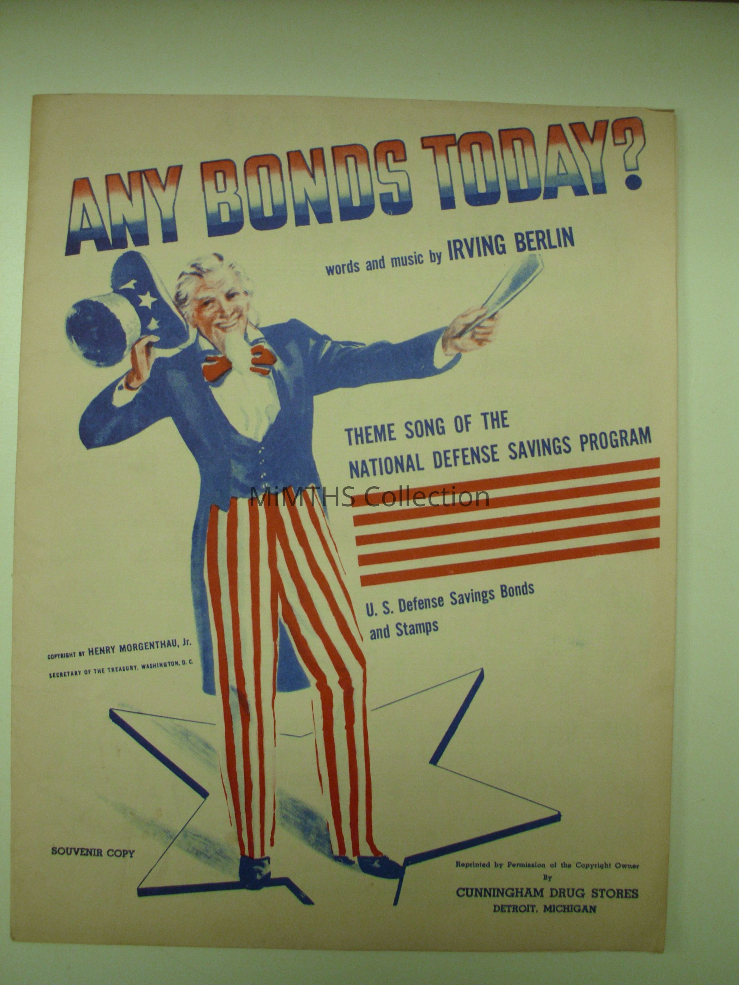Sheet music to Irving Berlins "Any Bonds Today" prtinted by Cunninham Drug Store, Detroit.