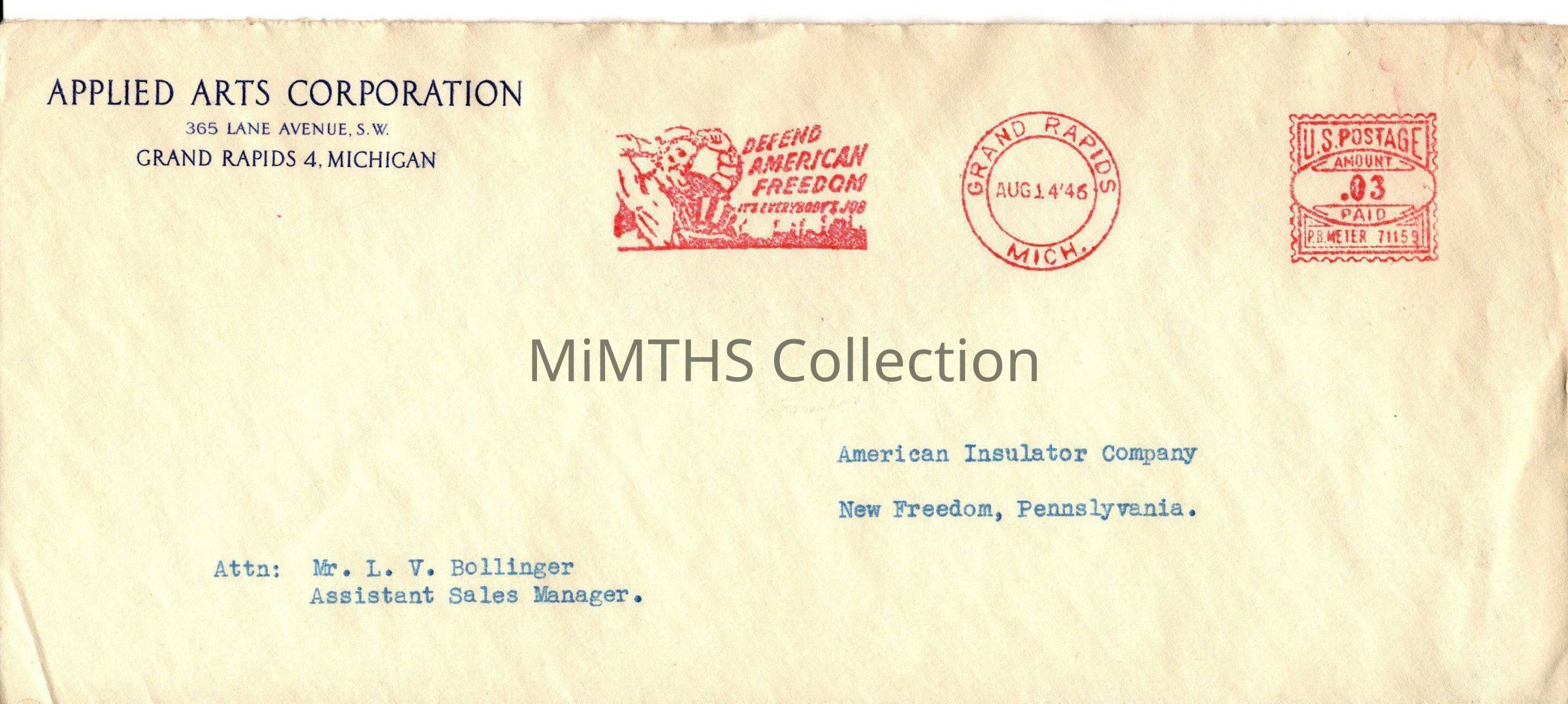 Buisness envelope with return address to the Applied Arts Corporation of Grand Rapids, 365 Lane St.