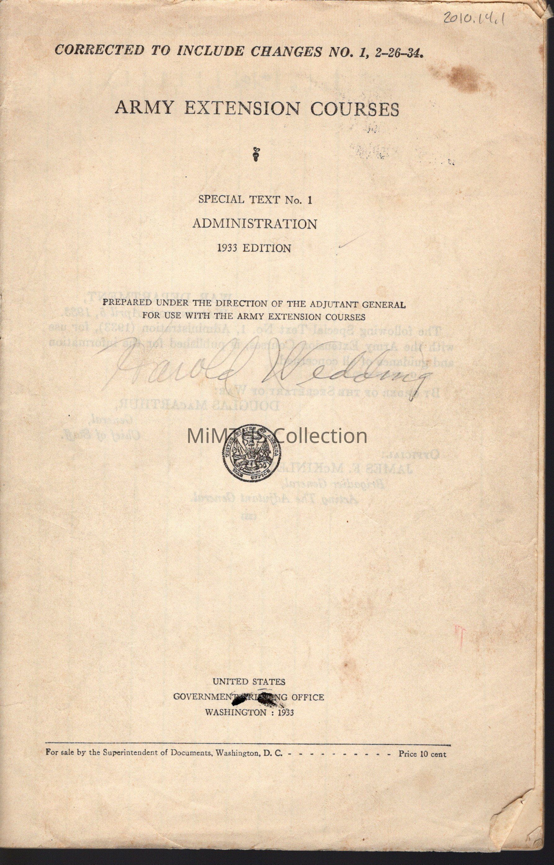 Army Extension course book marked to Lt Harold Wedding of the MSTCataloged By
