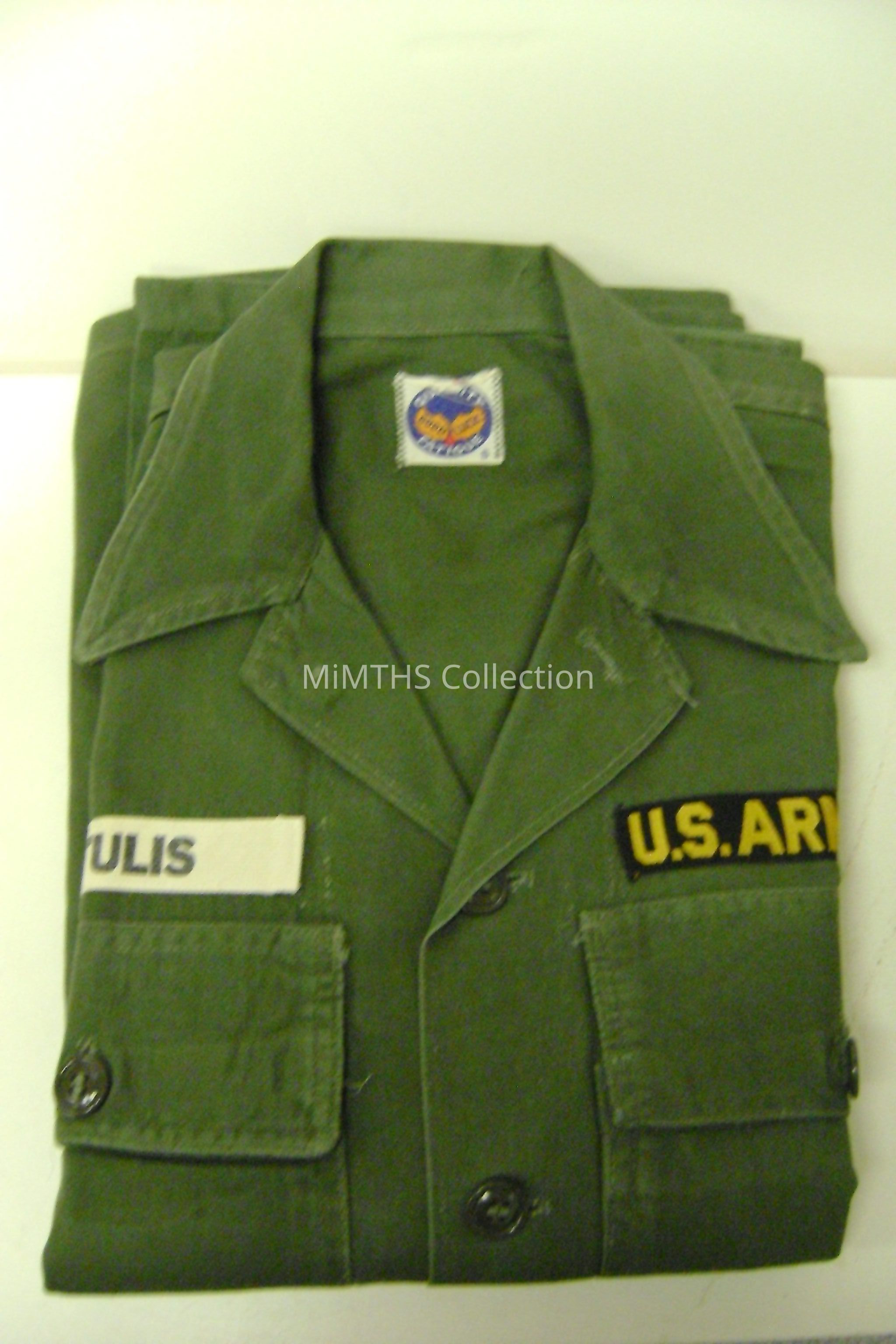 Army Fatigue Shirt, "Kotulius" name patch, "U.S. Army" patch, tag on the inside back says "Quality Good Luck Fatigue" size small.Cataloged By