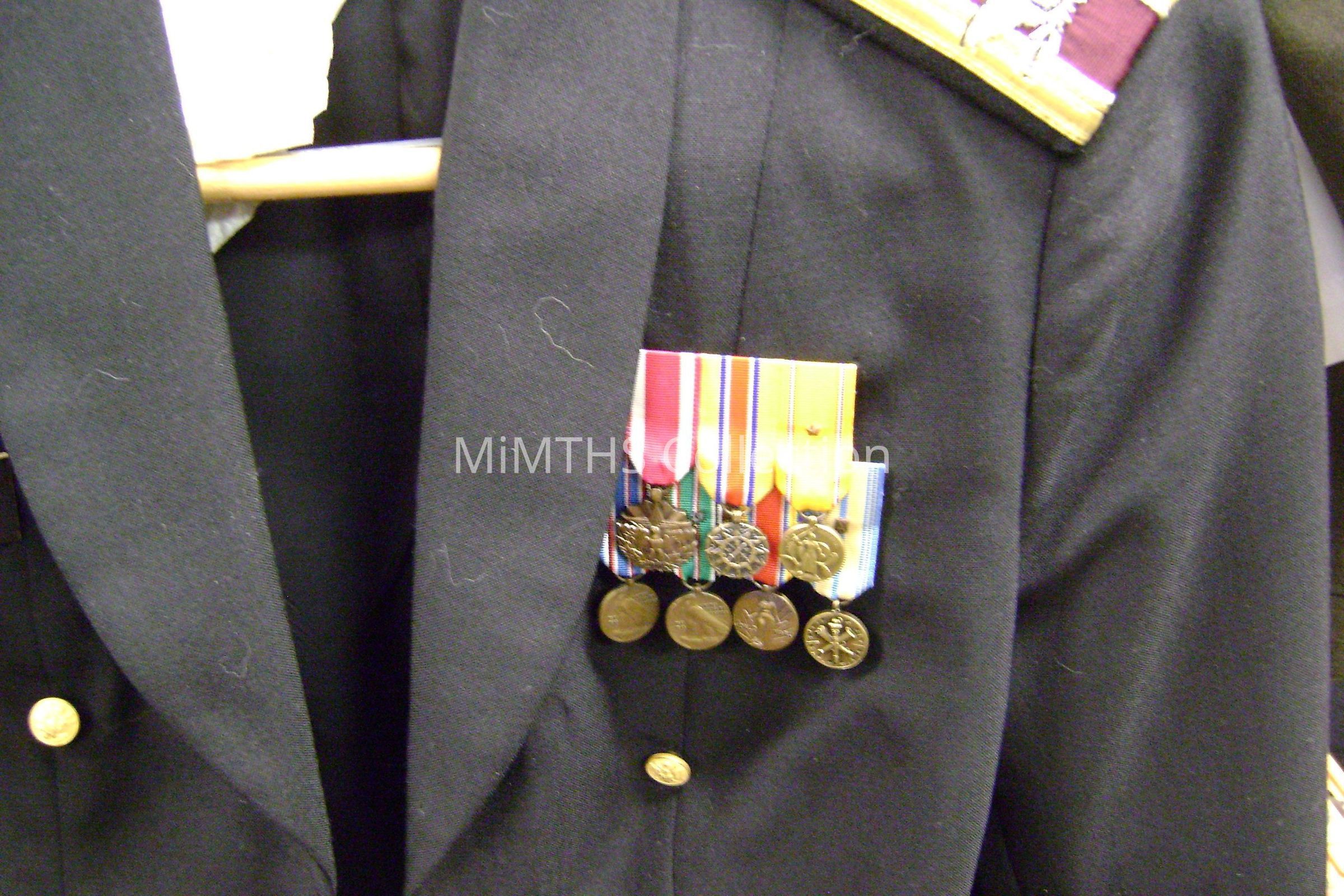 Ribbon Bar: Meritorious Service Medal, Reserve Components Achievment Medal. American Defense Service Medal w/ One star, American Campaign medal, European/African/Middle East Campaign Medal w/ one star, WWII Victory Medal, Armed Forces Reserve Medal,Cataloged By