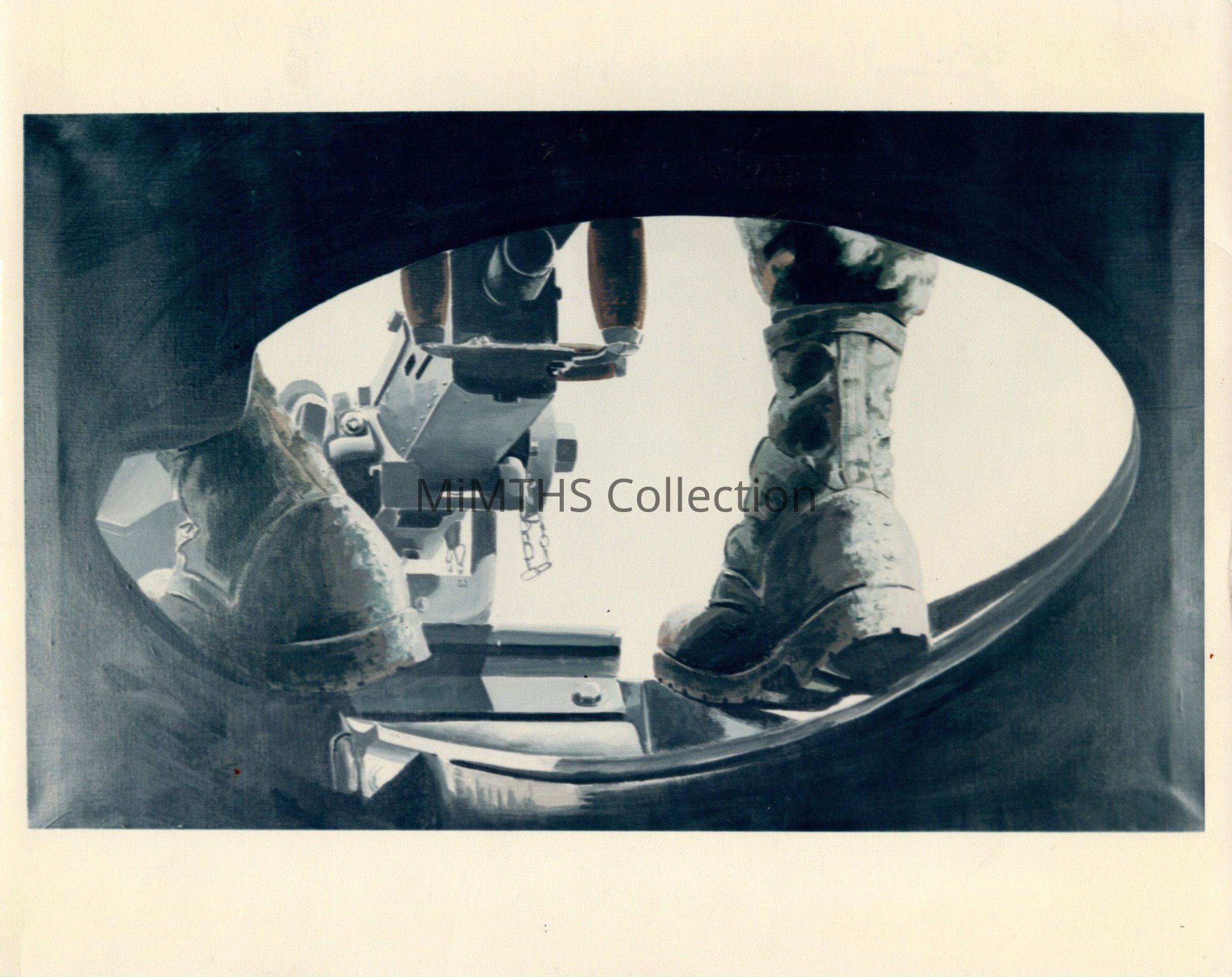 Reprint of a piece of art showing the hatch of an armored vehicle with boots on the rim and the back of an M2 .50 machine gun visible.