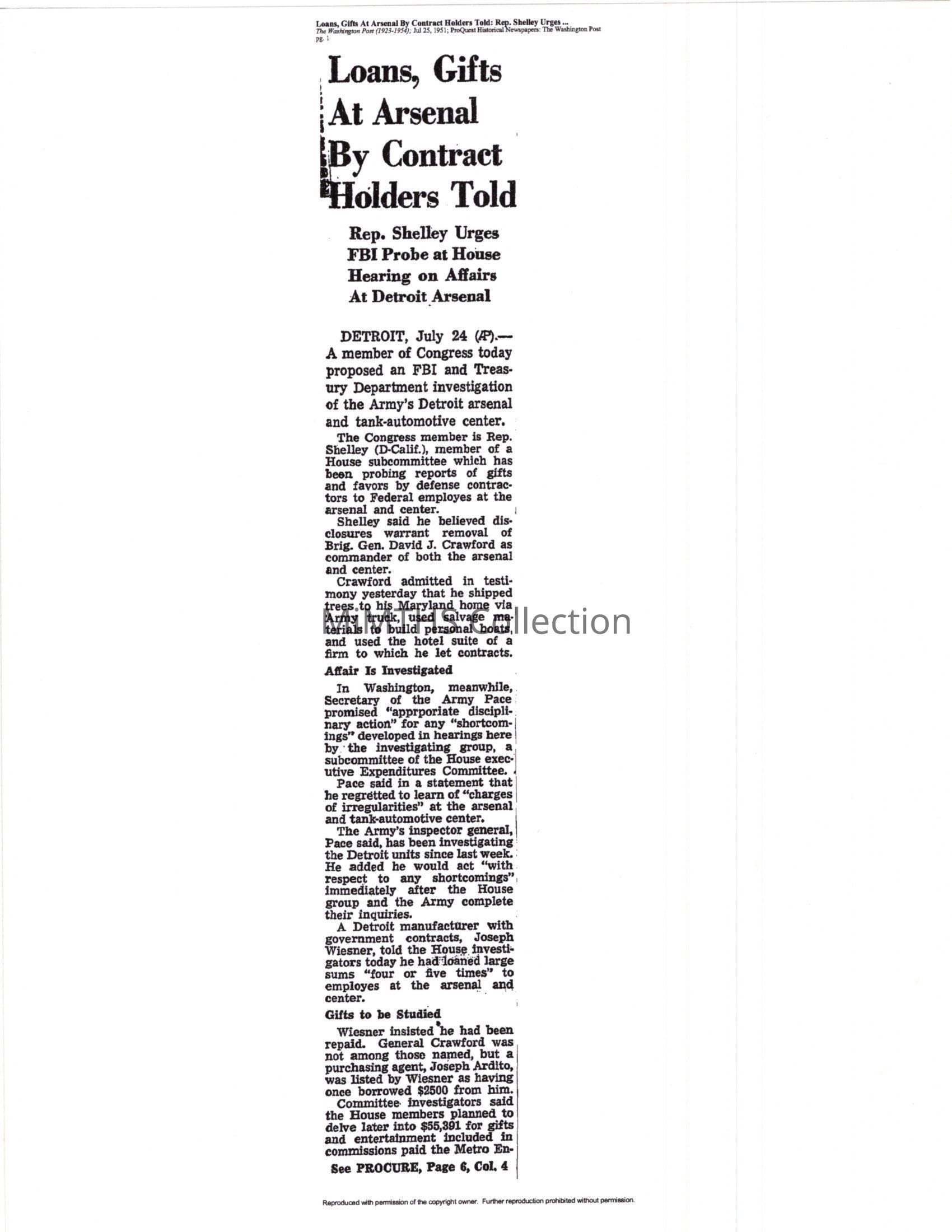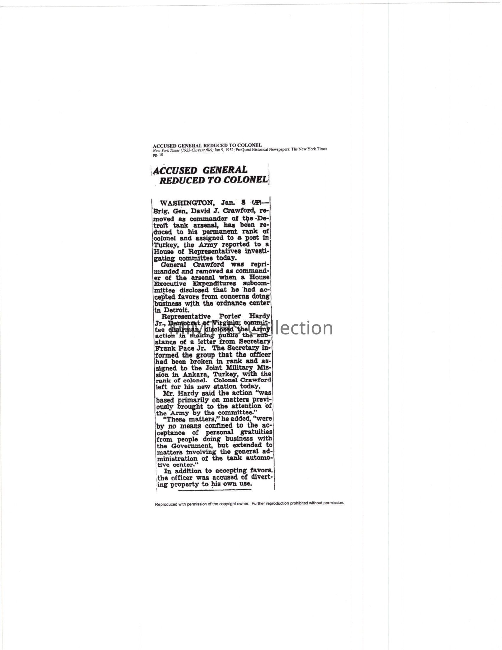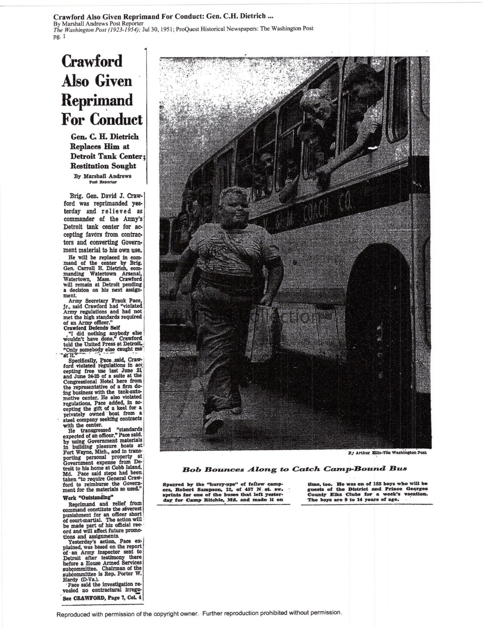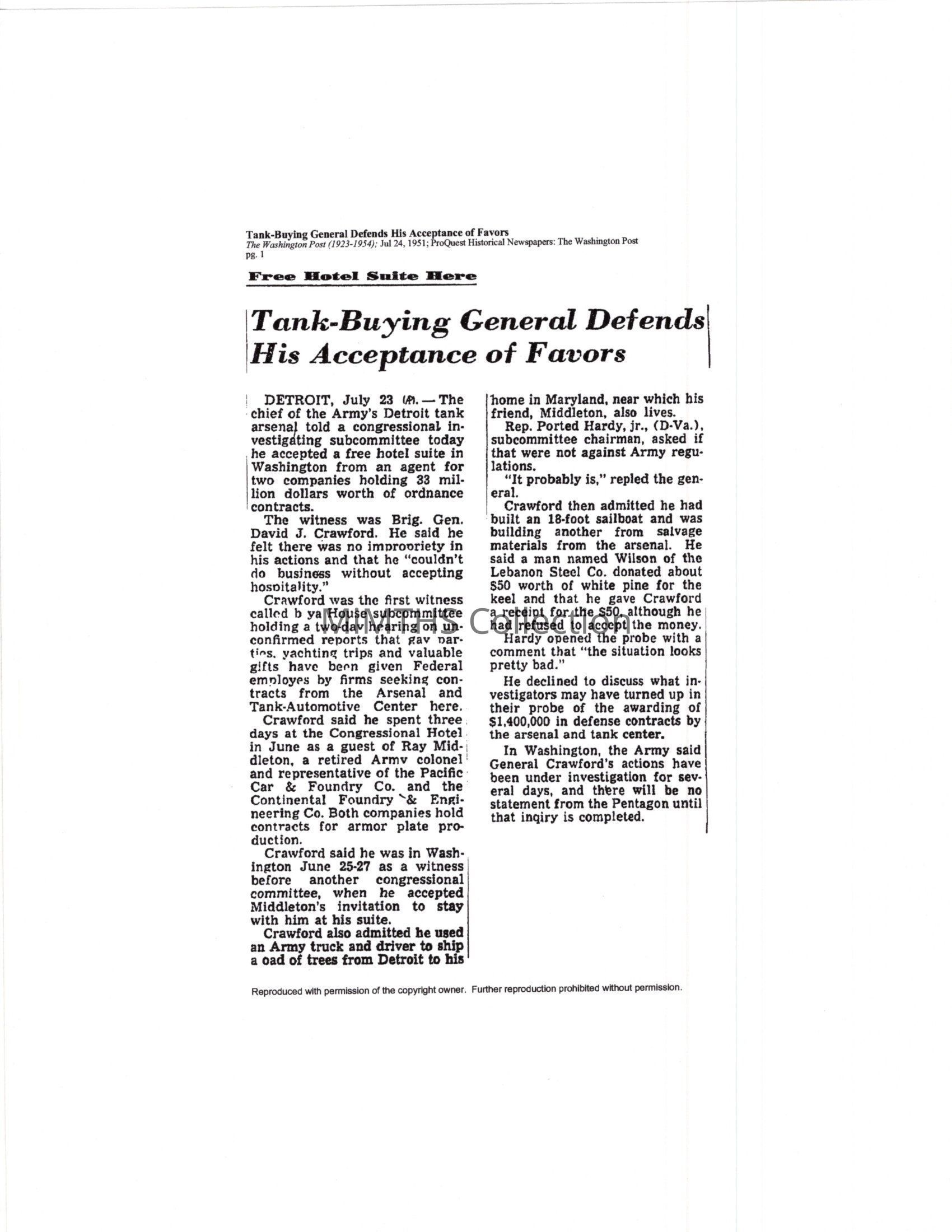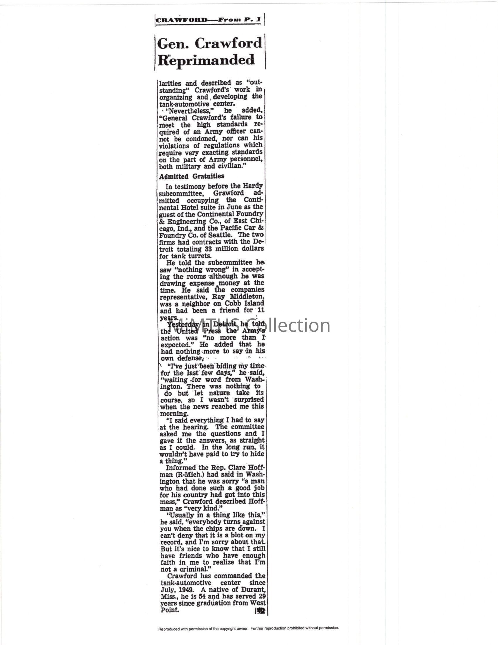 Everybody agreed that Brigadier General David J. Crawford was doing a fine job as head of the Army's big Detroit tank arsenal. But, on the side, he had been doing some things no officer should do, though they might have passed without notice in the Administration's mink and Deepfreeze civilian set. Traveling to Washington on an Army expense account, he twice stayed free in hotel suites kept by firms that held Army tank contracts. He had built himself a couple of nice, new sailboats from discarded materials at the arsenal, got the keel for one of them from an obliging steel company. He had also used Army trucks to haul the stuff out to his home. Last week, for "failing to meet the high standards required of an officer," the Army bounced West Pointer Crawford out of his command and gave him the stiffest penalty short of court-martial: a public reprimand, to be entered on his record.