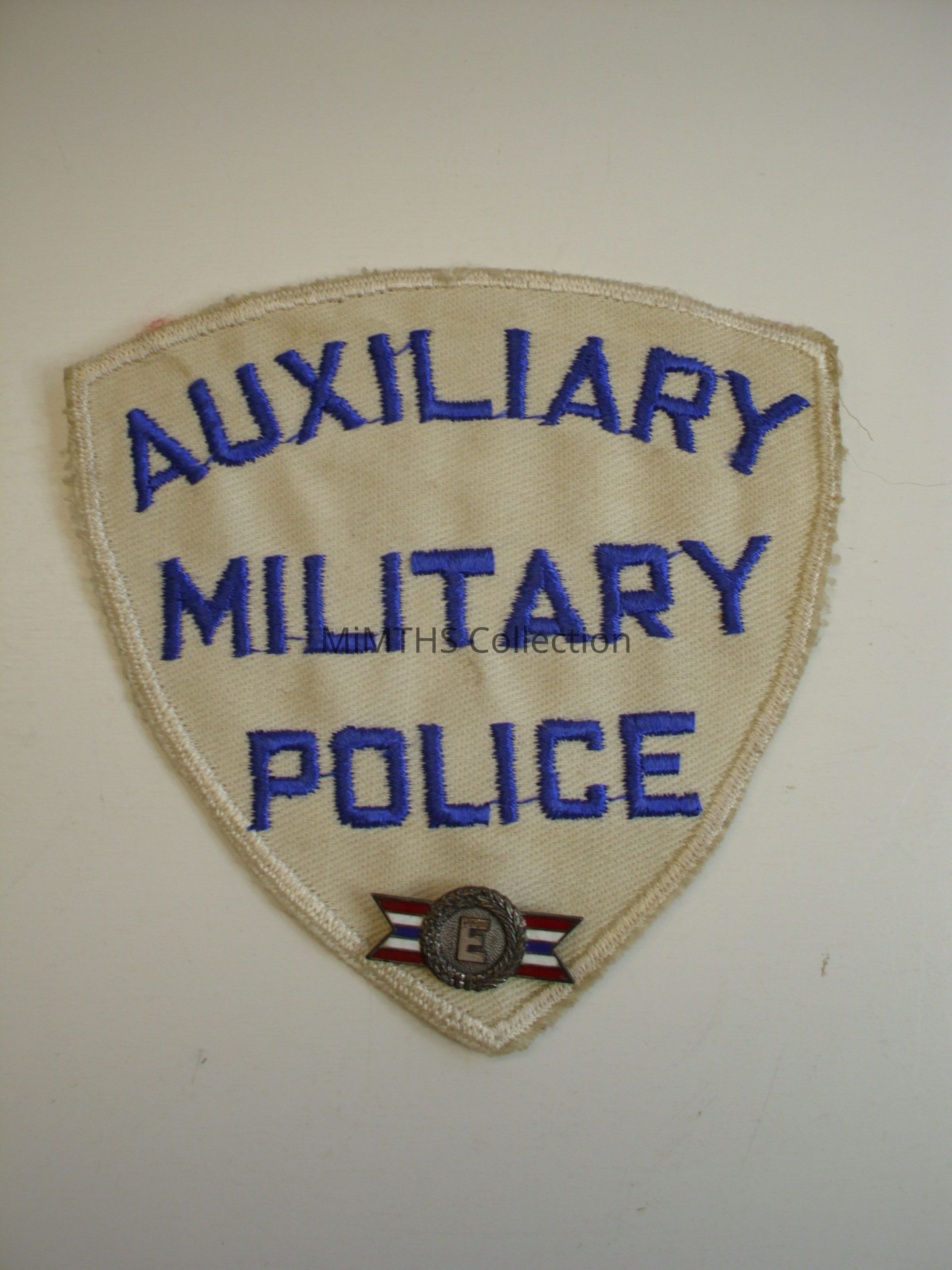 Large Auxiliary Military Police patch with Army Navy E award pin affixed.