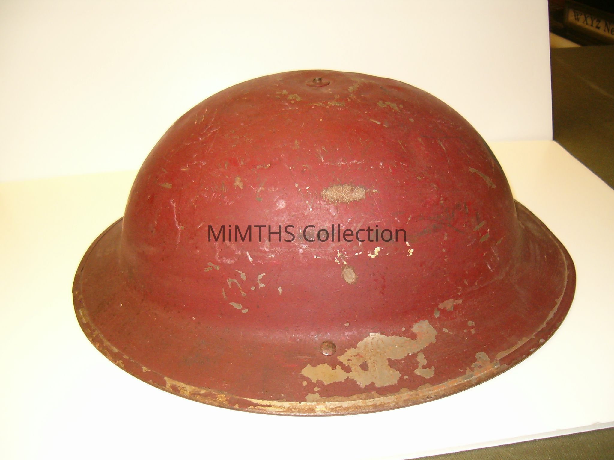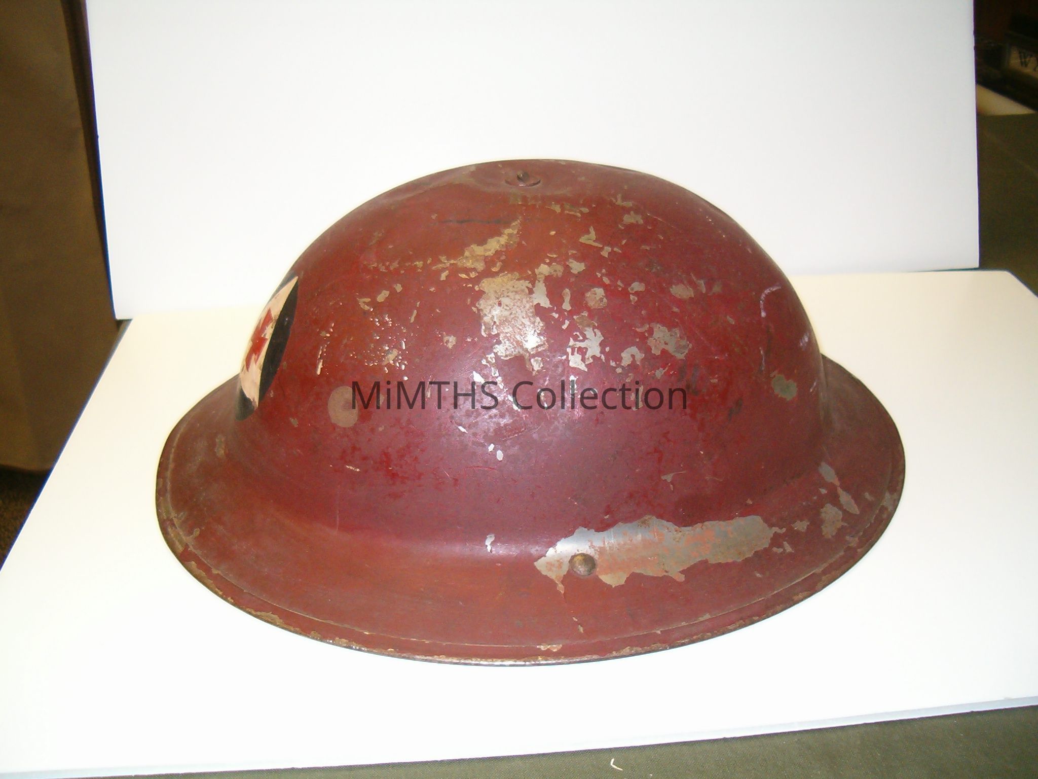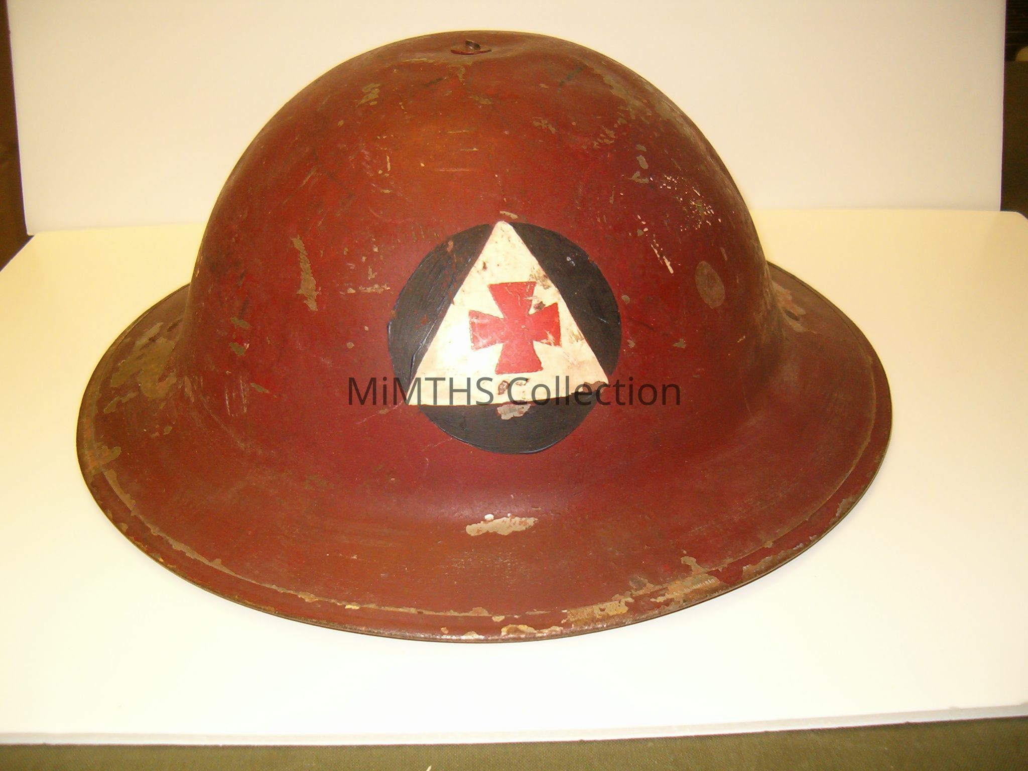Helmet in the "Kelly" style, made of steel (magnetic) Painted Red marked on front with maltese red cross, on a white triangle, inside a dark blue circle. Olive inside, stenciled "R.V.C. 629" Not sure on the exact origin of this helmet.Cataloged By