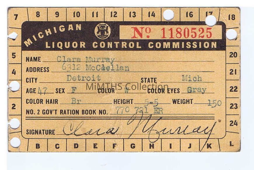 WWII Wallet card from the Michigan Liquor Control Commission assigned to Clare Murray of Detroit, went with a War Ration Book 2.Cataloged By