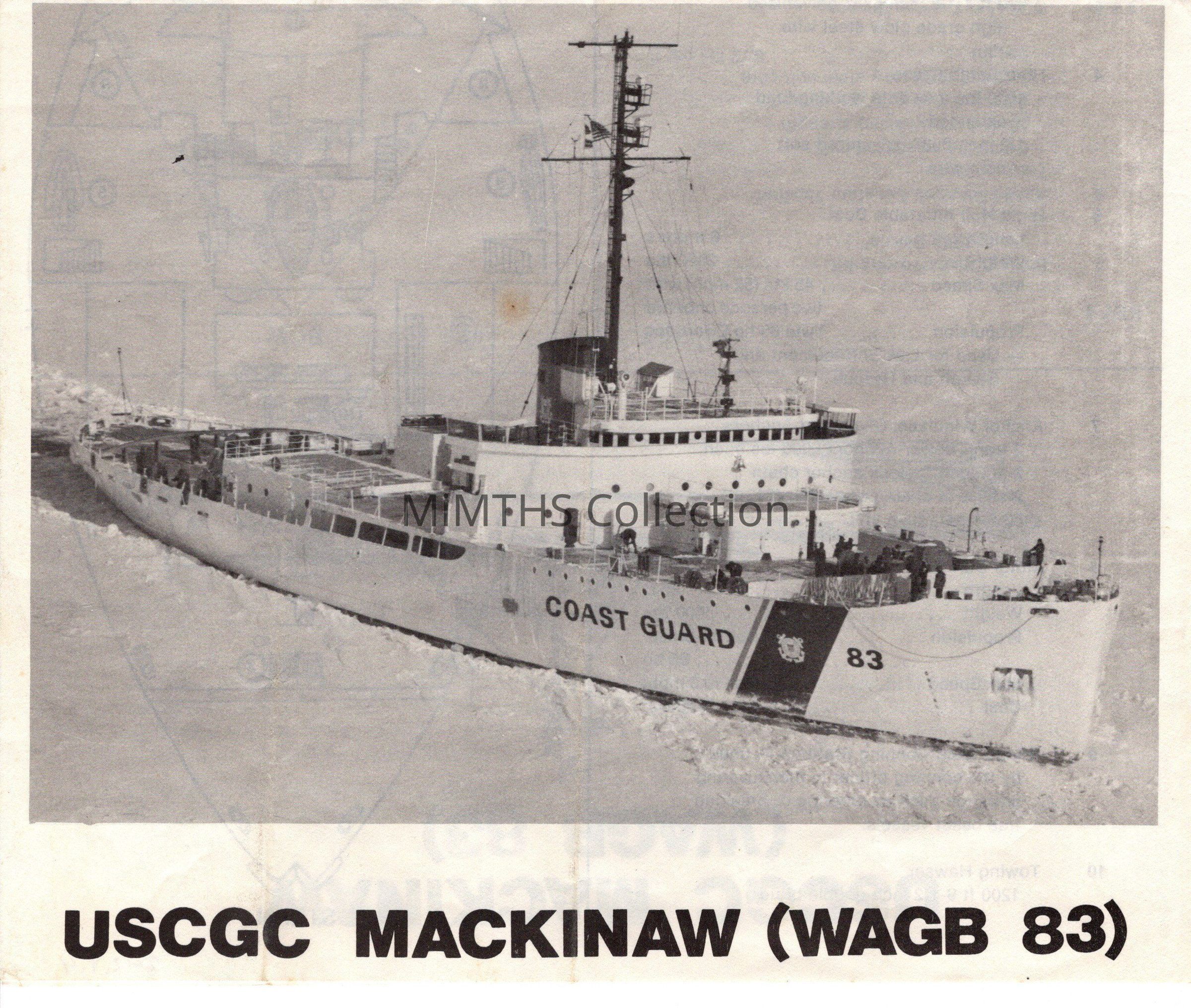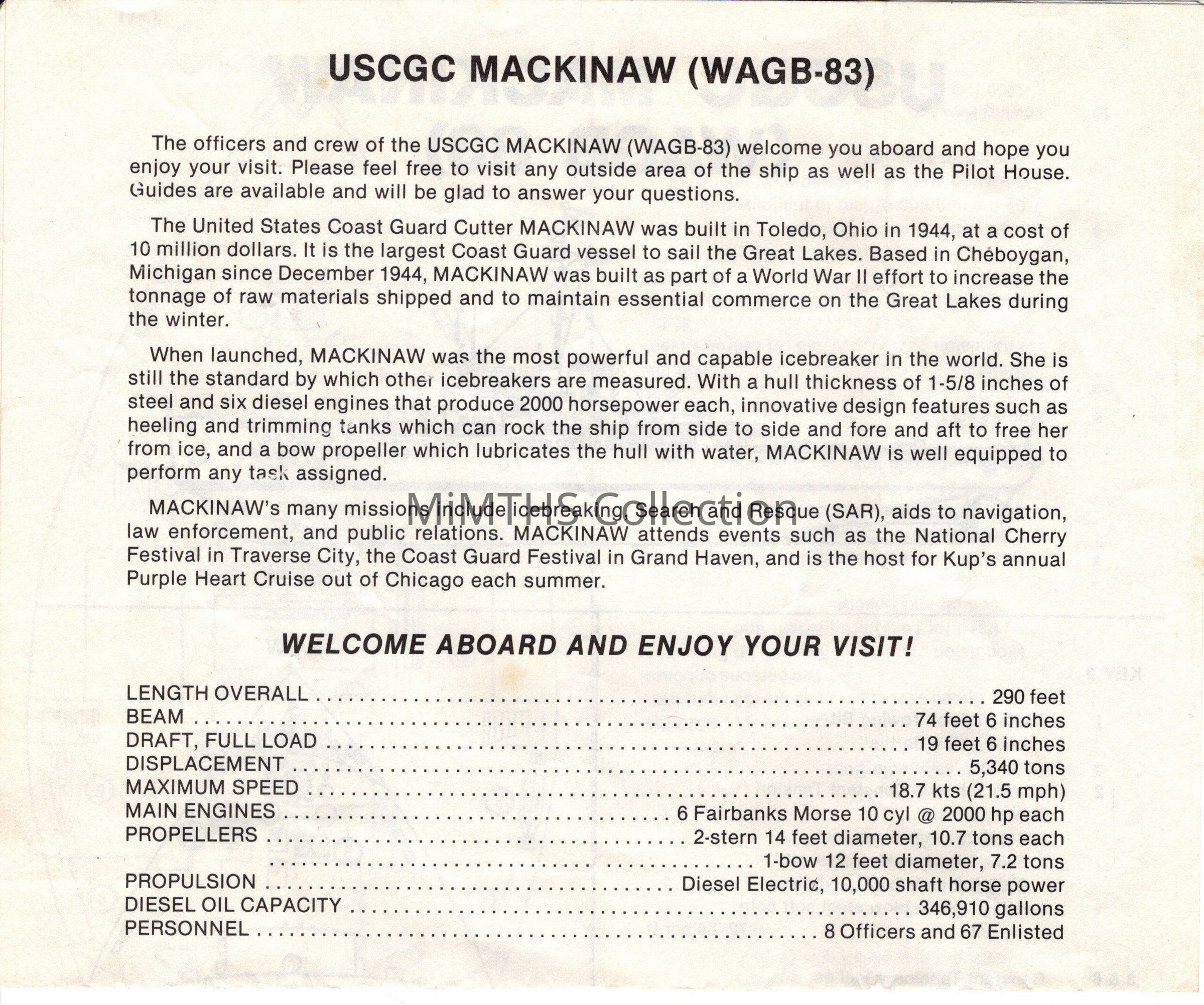 8.5x14 double side sheet with information on the USCGC Mackinaw. Appears to be a tour sheet printed prior to the ships retirment in 2006Cataloged By