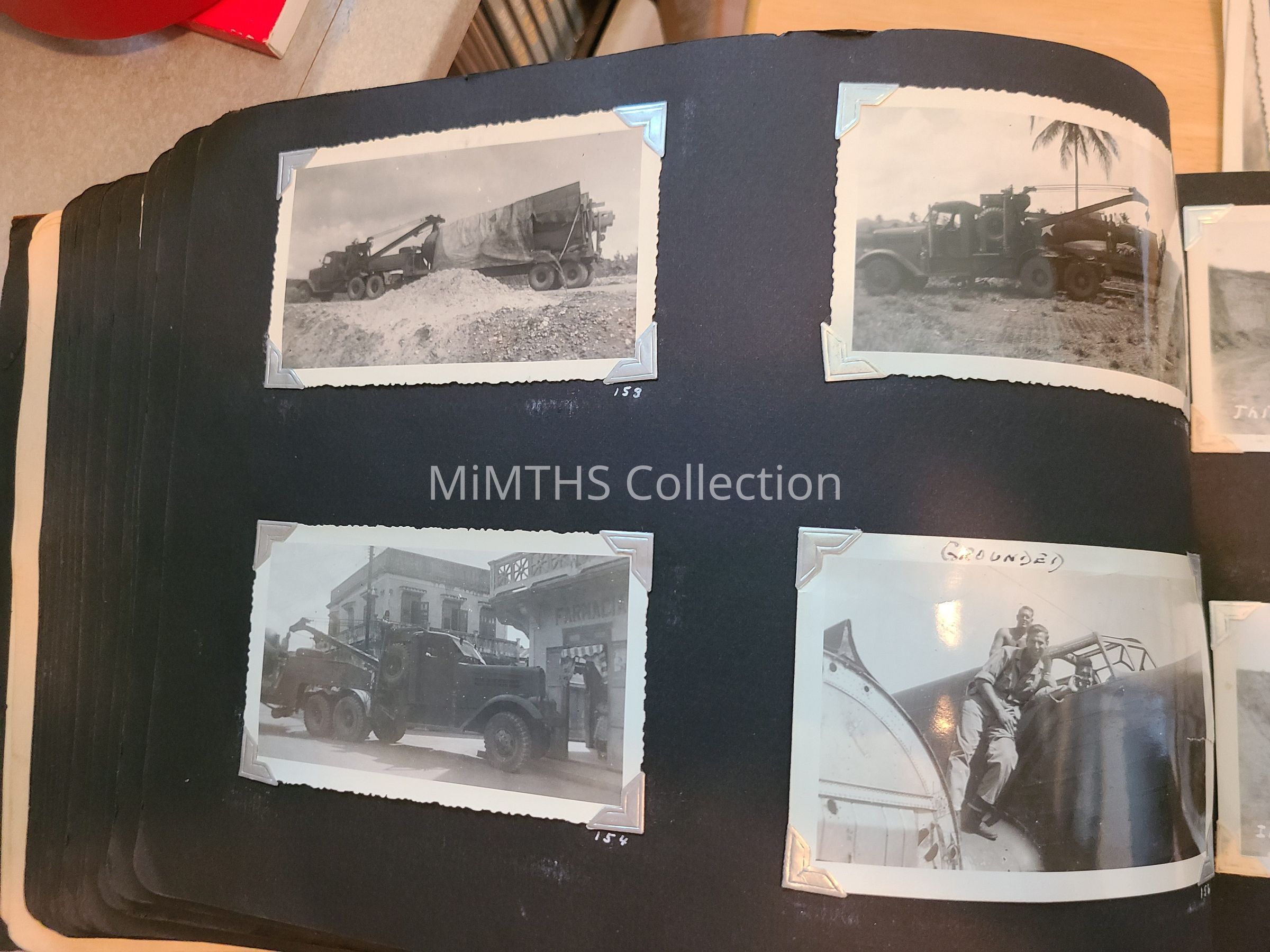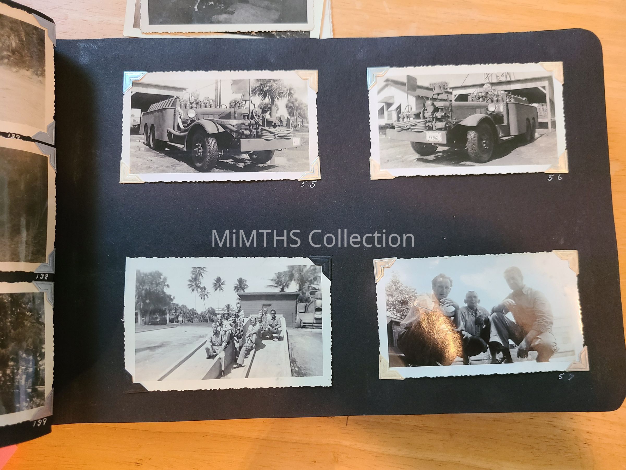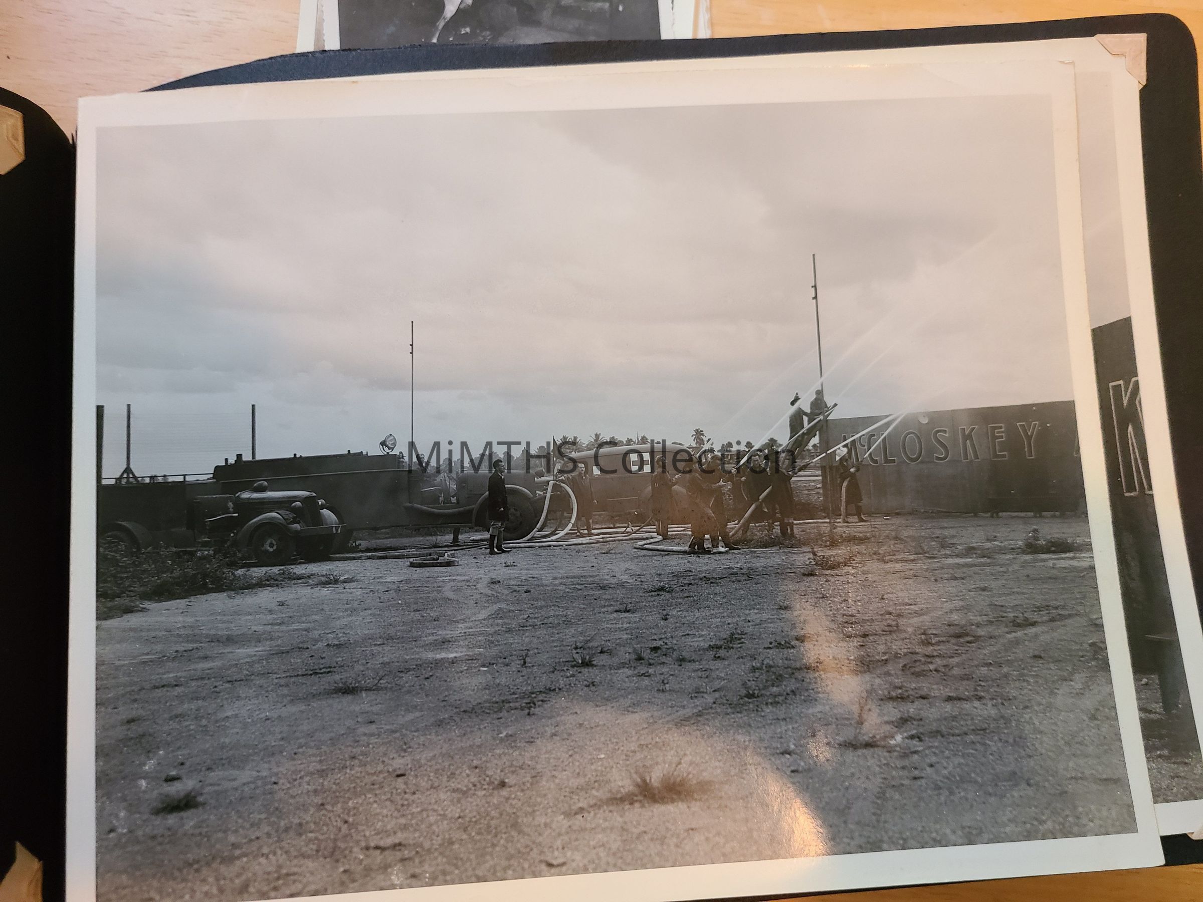 Photo album belonging to Paul Davenport of Michigan. Contains images from Borinquen Field Puerto Rico. Photos of people, buildings and vehicles, mostly wreckers and fire trucks.