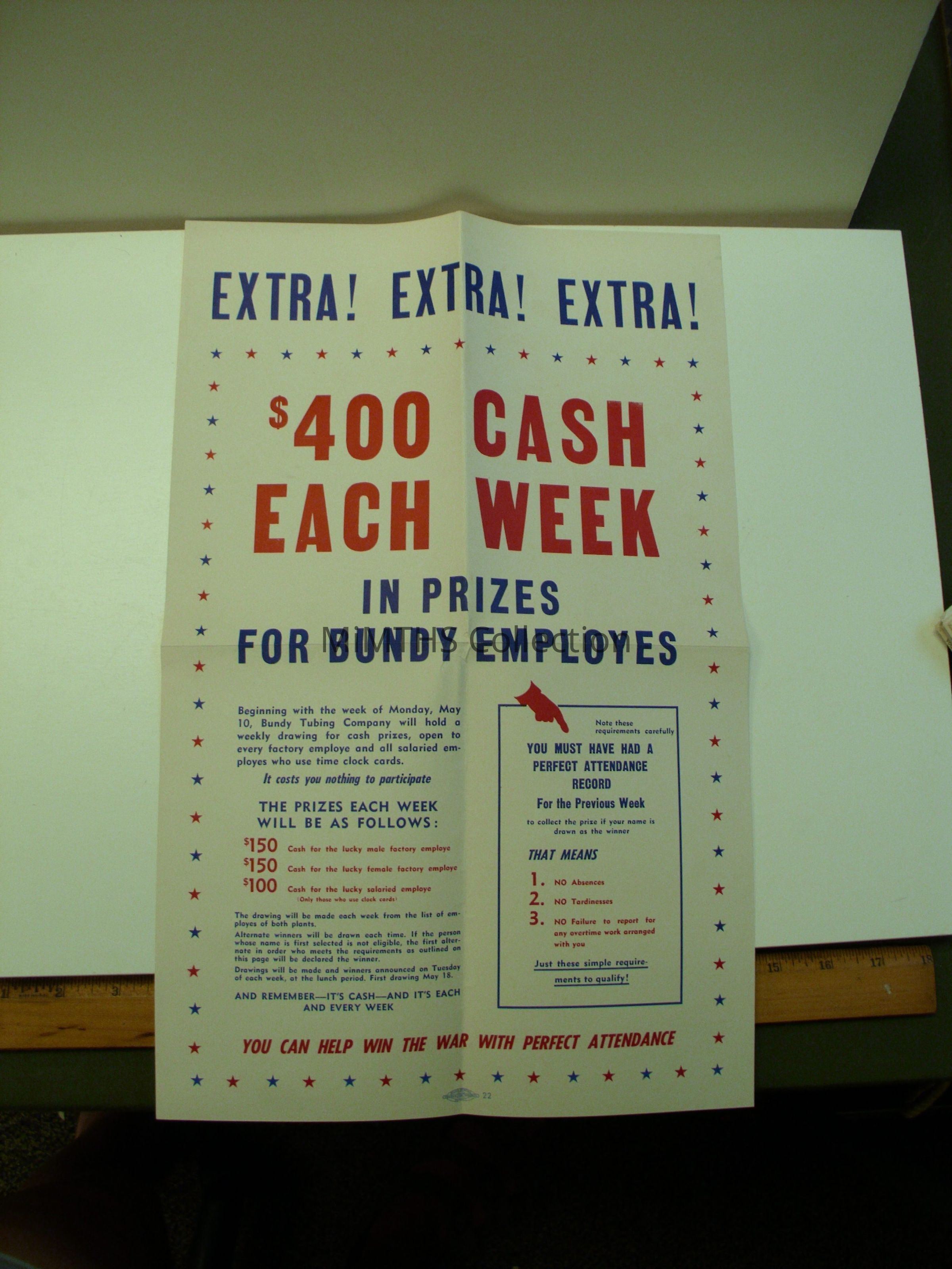 poster reading "$400 Cash Each Week," detailing prizes for Bundy Tube employees with good attendance records.Cataloged By