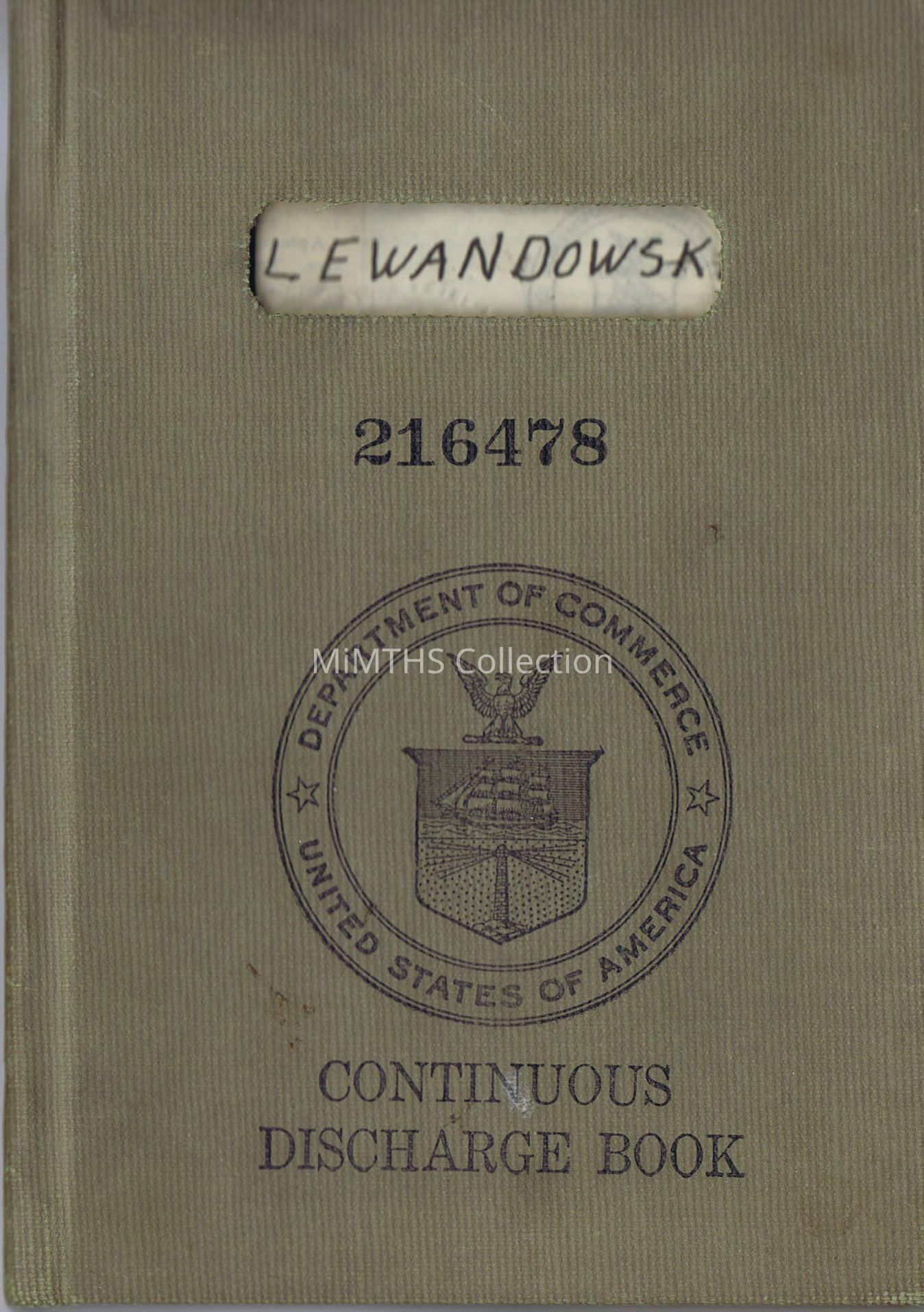 Continuous Discharge book of service for Bureau of Marine Inspection and Navigation issued to Walter Joseph Lewandowski, Circa 1938, Booklet from 1936 as 1936 edition.Cataloged By