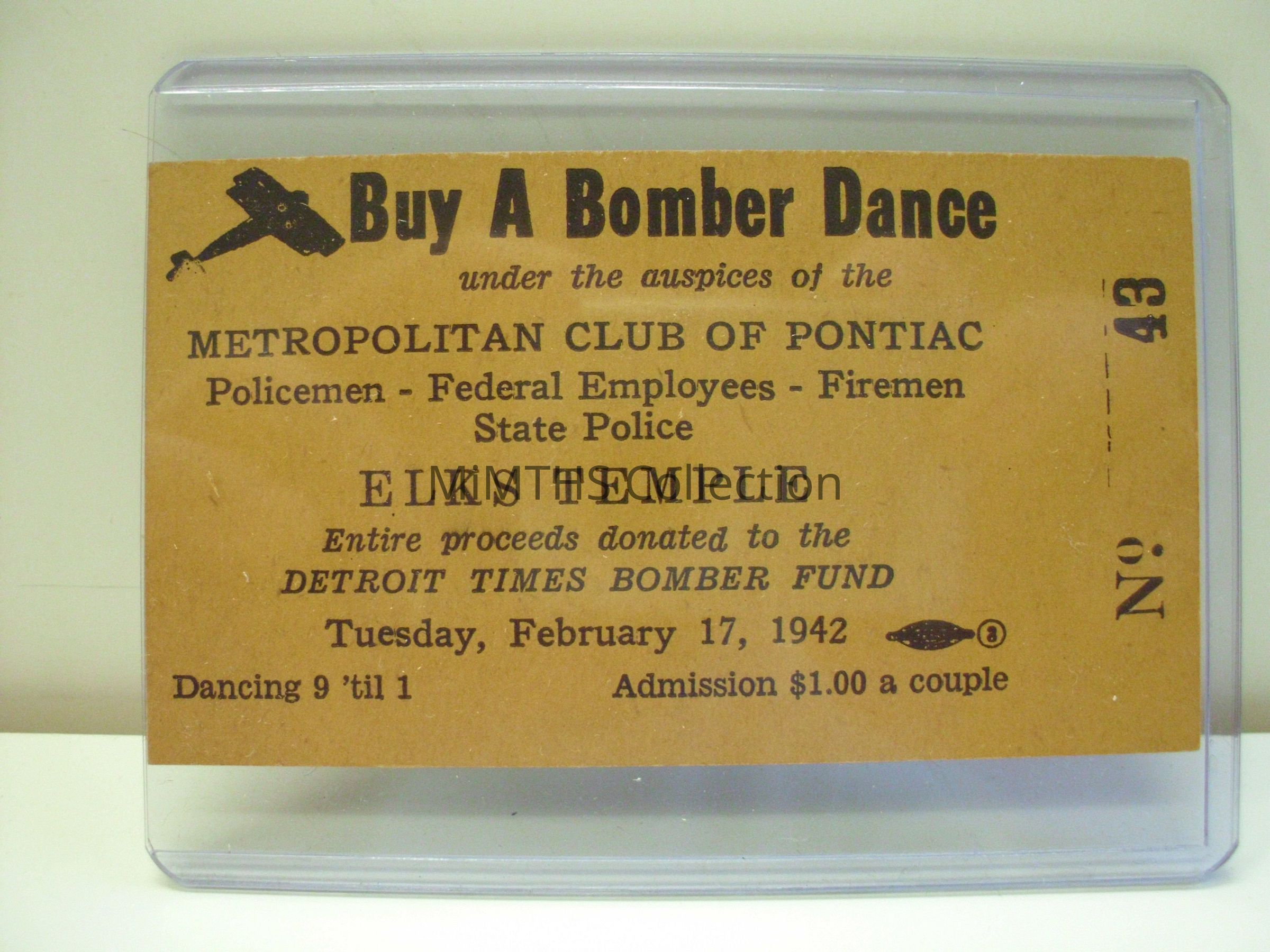 4x2 inch card ticket to the "Buy a Bomber Dance" put on by the Metropolitan Club of Michigan at the Elks Temple. Money for the Detroit Times Buy a Bomber Fund. Feb 17, 1942Cataloged By