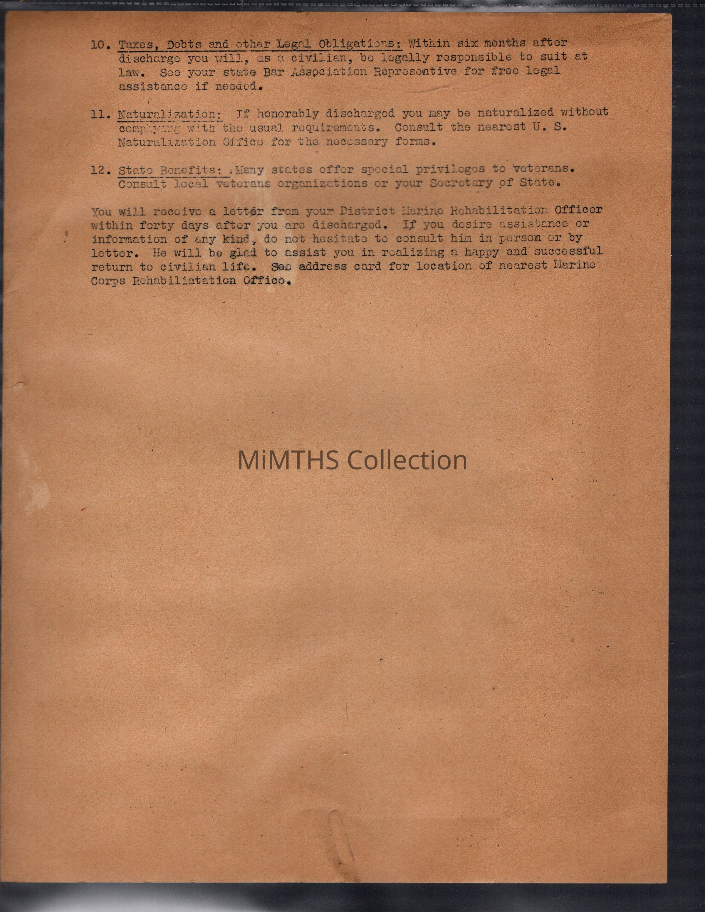 Post Discharge documents from the Marine Corps, includes info on registering war souvenir firearms and National Service Life Insurance endowments and premiums from VA. Seven pages in binder.Cataloged By