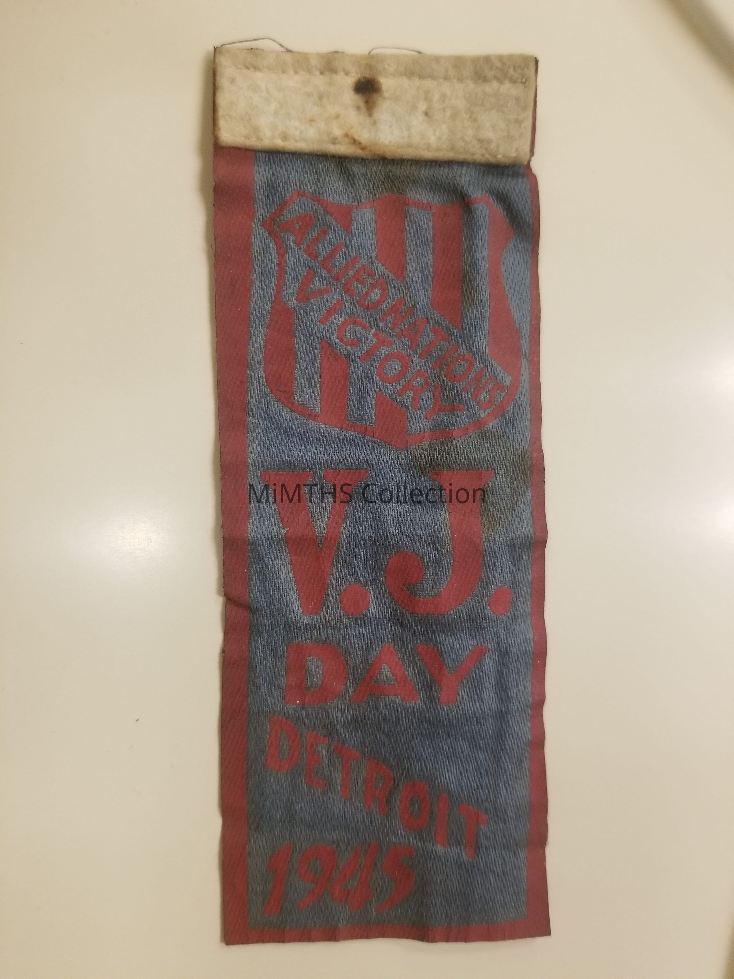 5.5x2 blue ribbon with "Allied Nation Victory, VJ Day Detroit 1945"Cataloged By