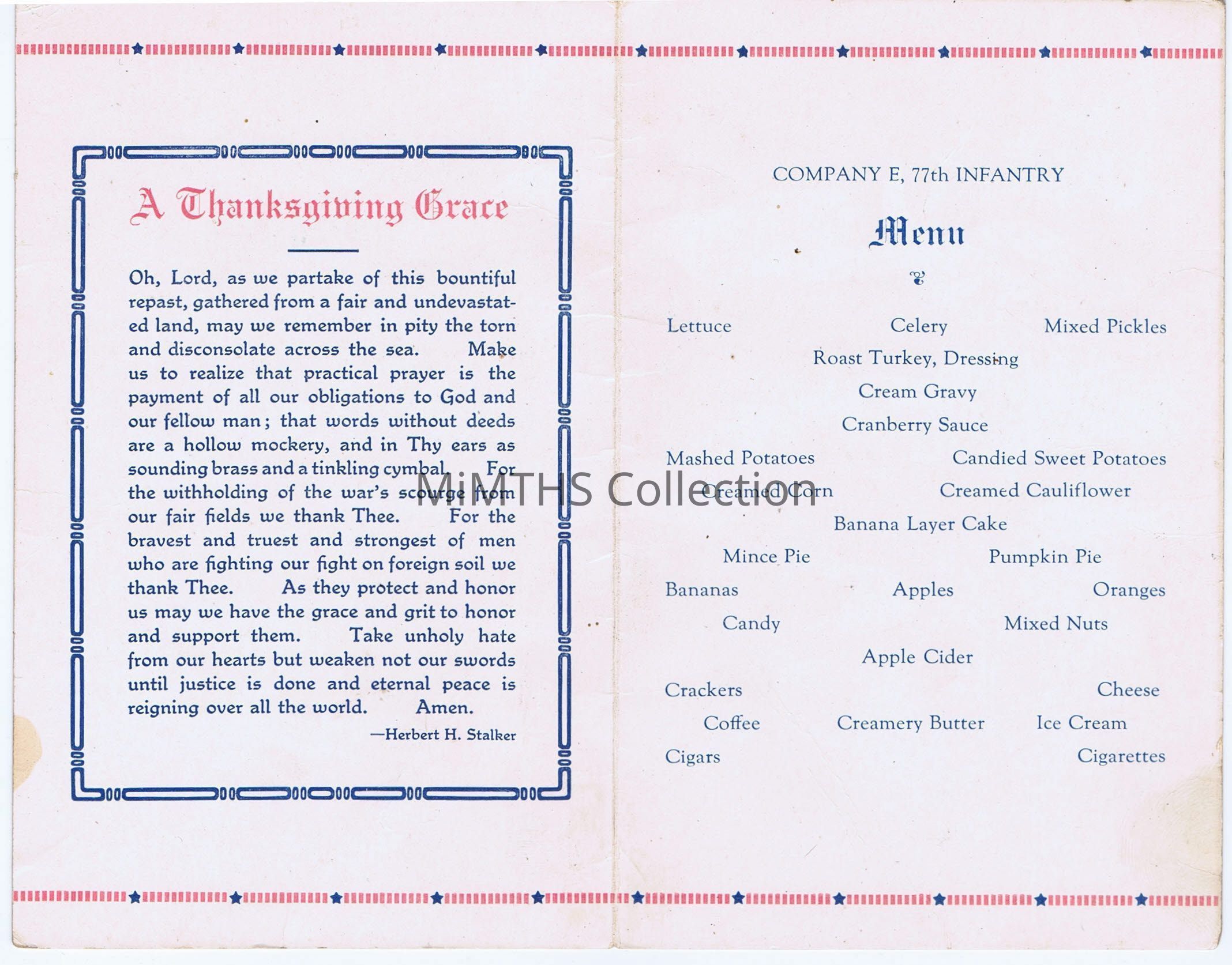 The folded menu from the Company E, 77th Infantry's Thanksgiving dinner at Camp Custer. List what was served and a thanksgiving prayer on the inside.Cataloged By