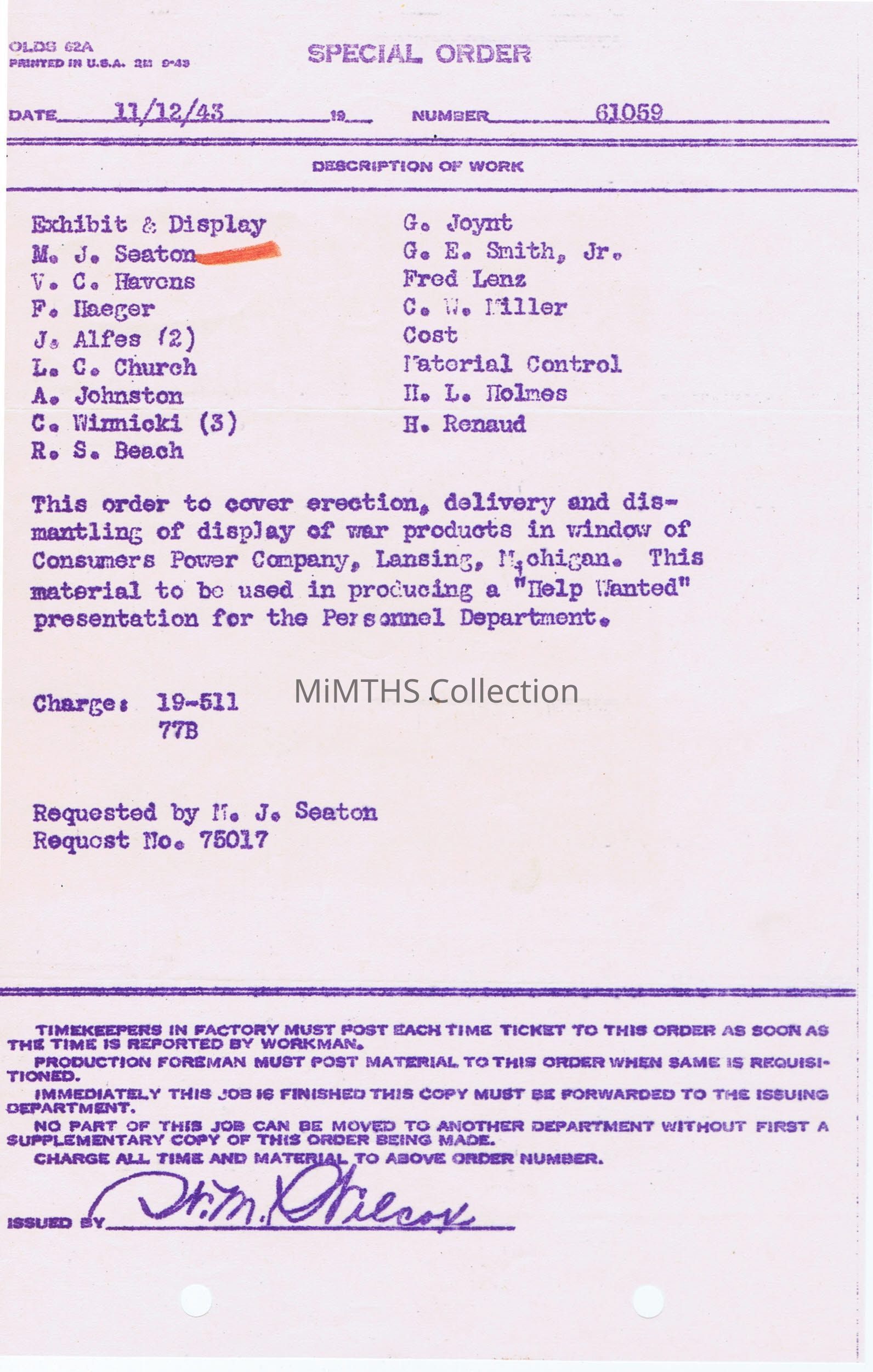 Order to cover the erection, delivery and display of a war products display in the windo of the Consumers Power Building in Lansing, MICataloged By