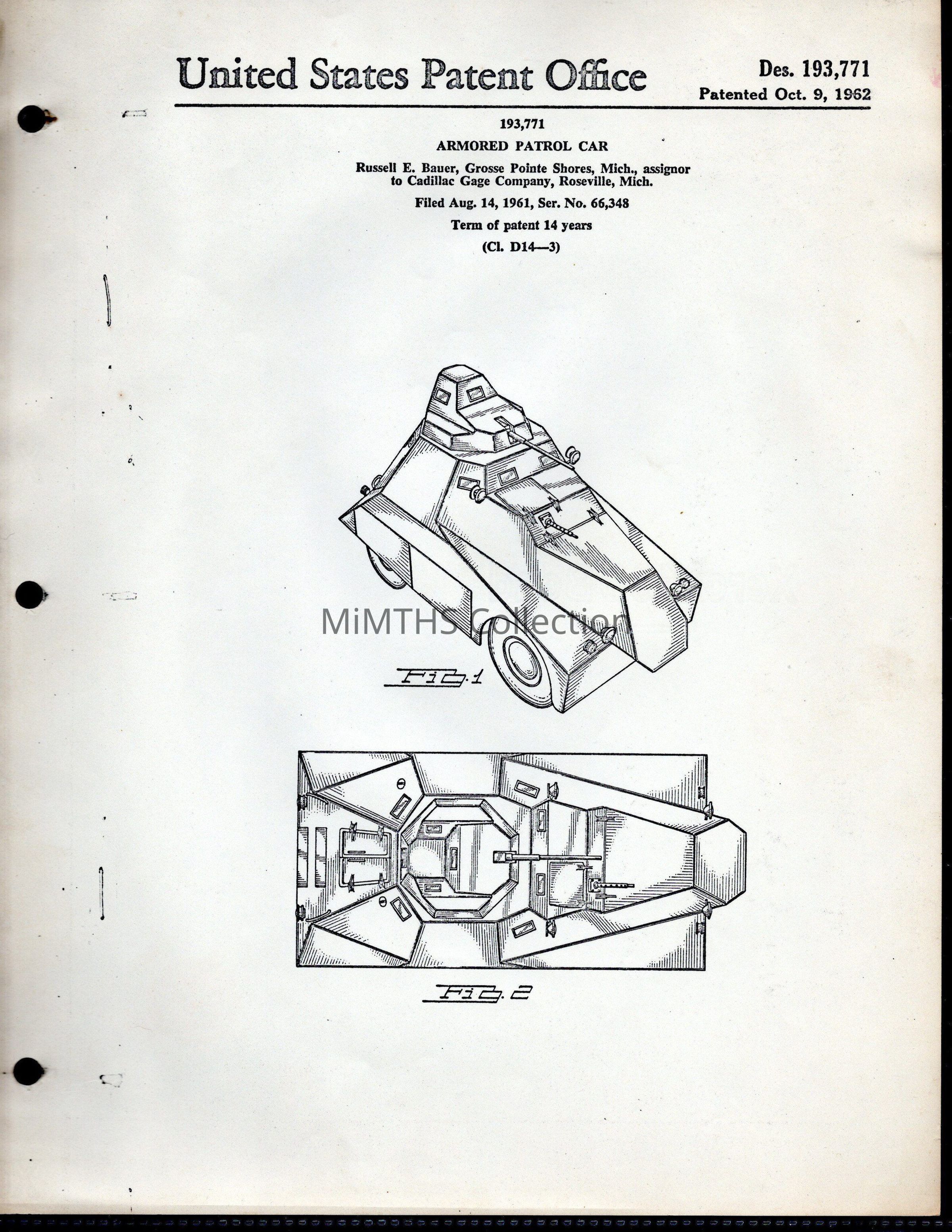 Patent record for Cadillac Gage armored patrol car. patent number 193,771. Pg 1 has two line drawings of different views of the vehicle.